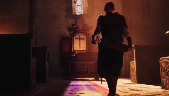 Les développeurs ne s’arrêtent pas là et prennent un soin tout particulier à retranscrire la complexité de l’histoire à travers les jeux de lumières. Dès le début du trailer, le ton est donné par son traitement et ses inspirations tels que les gigantesques fresques d’églises, les vitraux ternis par le temps ou encore les retables trônant dans toute leur splendeur dorée. Ici, le contraste est la clé, il joue son rôle à merveille et propose un visuel émotionnellement impactant. Le jeu oppose l’ombre épaisse des ruelles pestilentielles avec la lueur mordorée d’un cierge, ou la pâleur du jour filtrant à travers la porte d’une étable, et ainsi, la lumière et l’ombre s’imposent comme des personnages cruciaux.