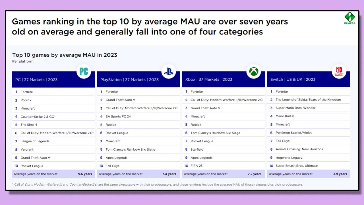 L’an dernier déjà, un autre rapport de Newzoo nous montrait que le classement des titres les plus joués sur chaque plate-forme étaient trustés par des titres sortis depuis des années, avec une moyenne de près de 10 ans pour Steam et plus de 7 ans sur console (exception faite de la Nintendo Switch). Une situation qui se poursuit donc aujourd’hui (voire se renforce) et qui pourrait, à terme, sonner le glas du jeu vidéo tel qu’on le connait aujourd’hui.