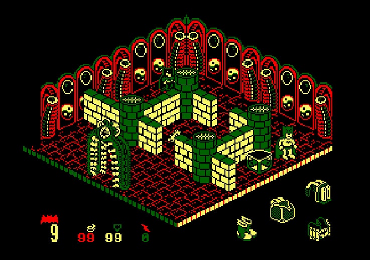En 1986, la série des 60’s est ringardisée, le film de Tim Burton n’est pas encore entré en tournage, la Batmania n’est absolument pas à l’horizon. Ce qui permet à Ocean Software d’obtenir la licence pour une bouchée de pain, et réaliser le tout premier jeu vidéo Batman. Conçu en 3D isométrique comme de nombreux jeux des 80’s (dont l’exemple le plus connu est sans doute Q*bert), le jeu est aussi connu pour être l’un des tous premiers à proposer des points de contrôles, qui permettent de reprendre une partie en cours de niveaux, et non pas au tout début de ceux-ci.
