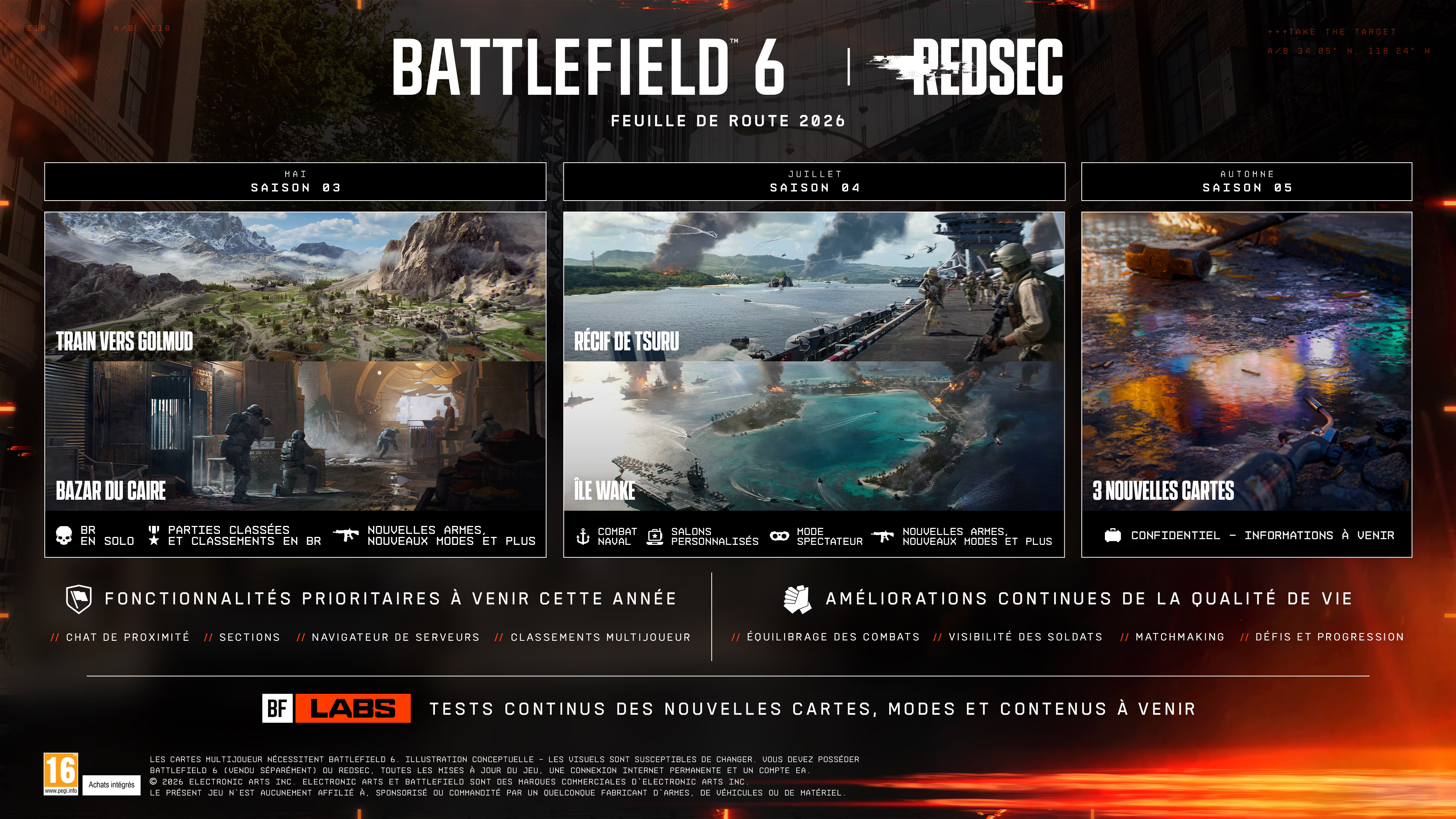 C’est précisément sur ce terrain que DICE semble vouloir revenir aux fondamentaux de la série. C’est à partir de mai que l’on pourra découvrir les premières nouveautés : on retrouve ainsi Train vers Golmud (remake de la carte de Battlefield 4) ainsi que Bazar du Caire (remake de la carte de Battlefield 3). Le mode classé fera également son apparition. Pour les fonctionnalités à venir, le navigateur de serveurs fera son grand retour. Le chat de proximité, le mode spectateur et le classement multijoueur seront également de la partie.