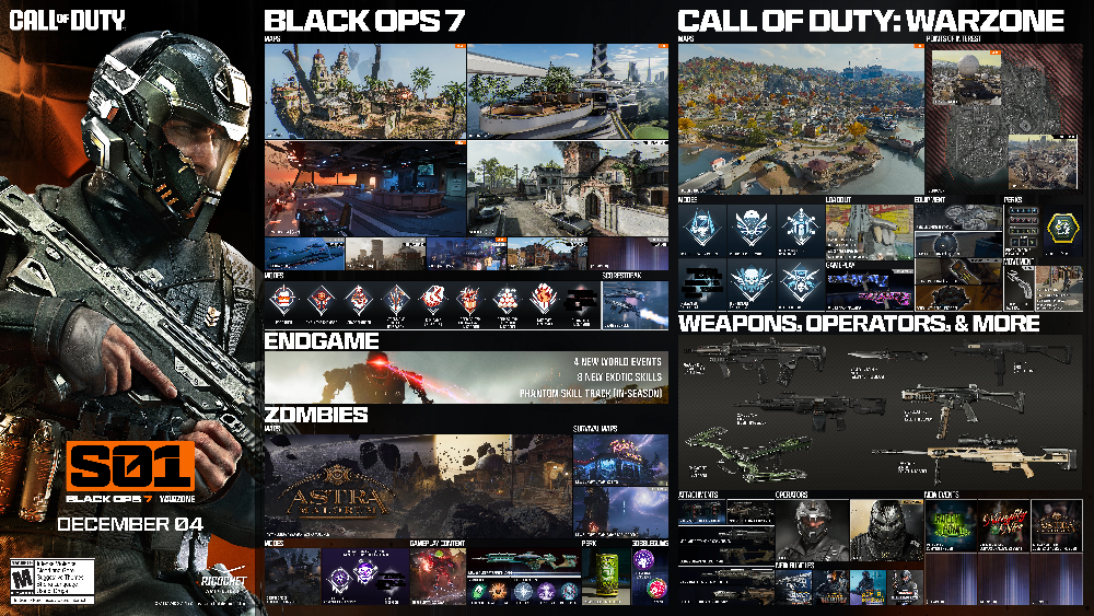Aujourd’hui, Activision dévoile le contenu de sa saison 1 qui sera riche en armes, cartes et modes de jeu pour les différentes expériences proposées par Call of Duty: Black Ops 7. Le jeudi 4 décembre, les joueurs du monde entier pourront parcourir de long en large la nouvelle carte Warzone et continuer de cavaler dans Verdansk qui proposera de nouvelles installations. Rien de bien neuf sous le soleil si ce n’est que toutes les particularités globales de cette saison 1 seront implémentées au cœur du battle royale, comme les 7 nouvelles armes, les nouveaux défis hebdomadaires, le pack de combat inédit et le nouvel opérateur Scorn.