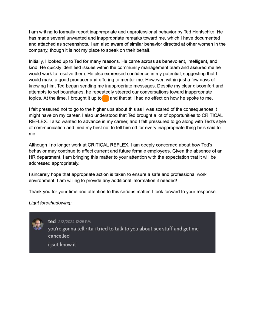 Elle accuse un ex-producteur de Critical Reflex, Ted Hentschke, de comportements répétés de harcèlement sexuel et de violences psychologiques, évoquant des messages déplacés et des échanges totalement inappropriés. Il suffit de parcourir une infime partie de l’historique des conversations Discord qu’elle a rendues publiques pour mesurer la gravité de la situation.