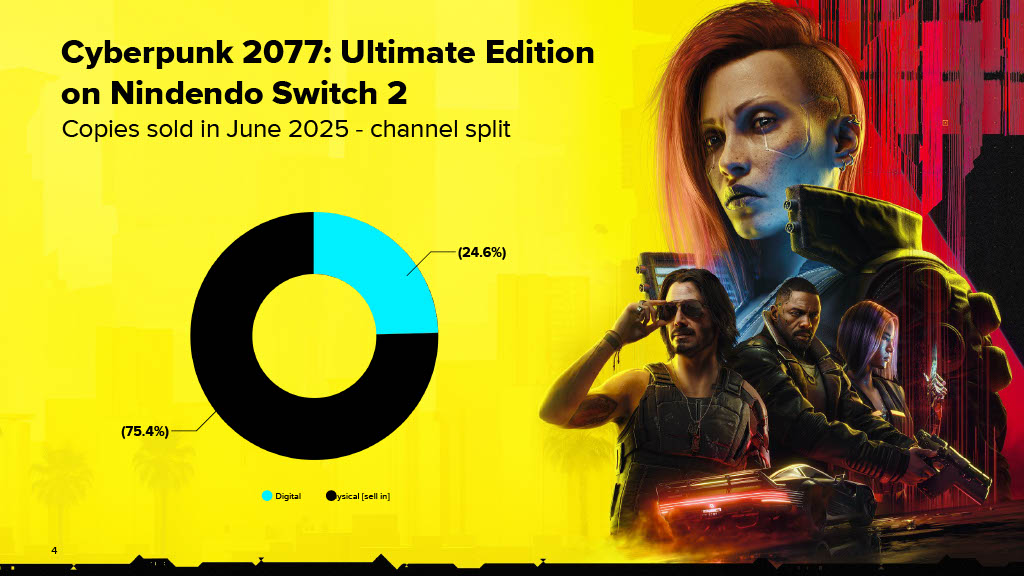 Voilà une nouvelle qui va relancer le sujet des Game Key Cards de la Switch 2. Après que la Bibliothèque Nationale de la Diète ait expliqué à Nintendo qu’abandonner un support physique contenant le produit culturel, c’est empêcher que ce dernier puisse être conservé et perdurer, CD Projekt Red en remet une couche en dévoilant son rapport financier pour le début d’année 2025. L’emphase est mise sur les ventes de Cyberpunk 2077, dont les trois quarts des copies vendues sur Switch 2 sont des éditions physiques.
