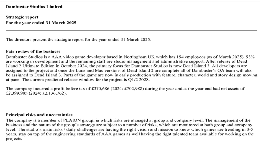 À première vue, il y a là, à défaut d’une présentation publique, une preuve évidente quant à la production de l’épisode. Et il en est même un peu plus : le papier indiquaient effectivement l’état du projet, en plus de donner une vue sur le staff et les 194 employés officiant à Dambuster. Une réalisation qui se porterait bien et serait devenue, selon les propos partagés, la préoccupation principale du studio. Surtout depuis la fin du développement des versions Mac et Luna de Dead Island 2 (disponibles depuis l’été 2025) qui a permis le redéploiement de l’ensemble des équipes.