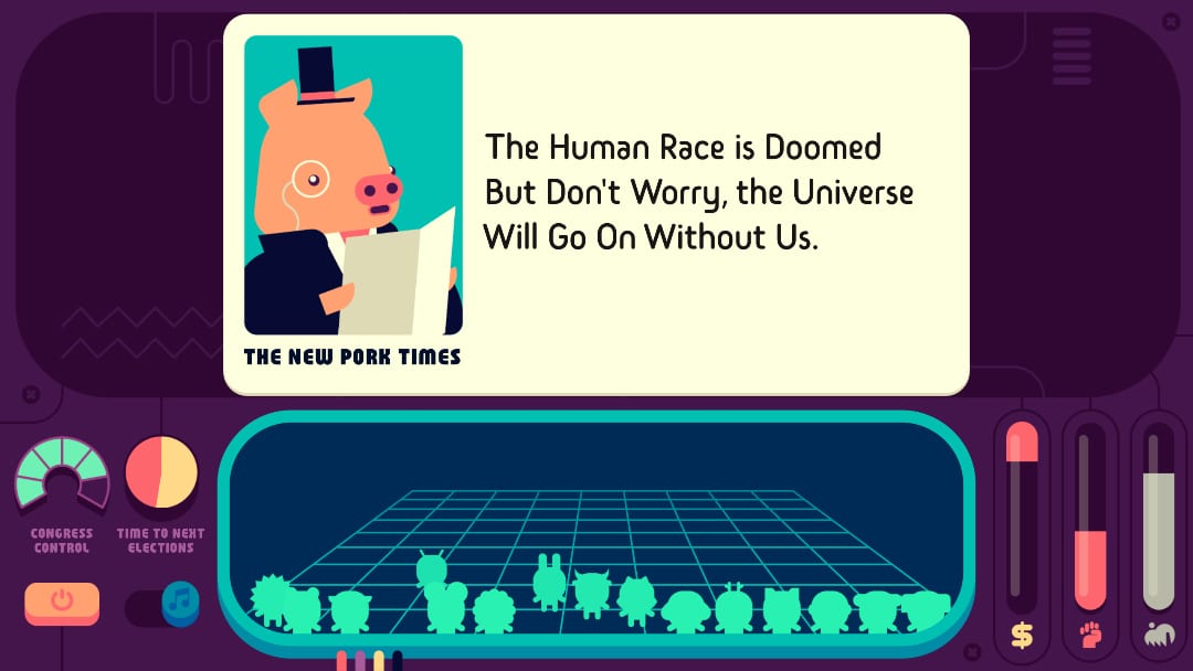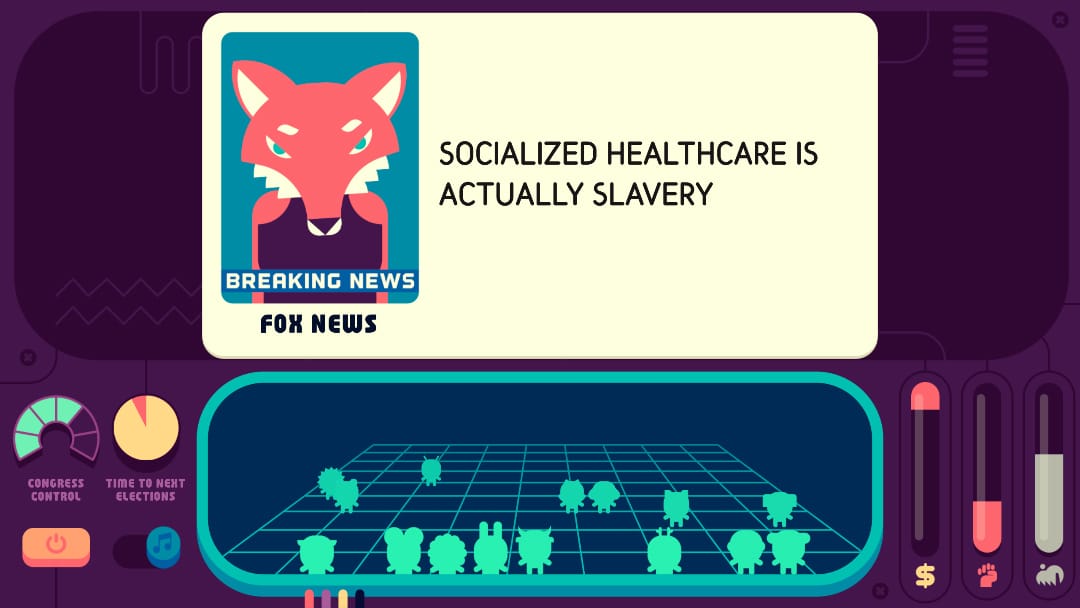 Avec Democratic Socialism Simulator, Molleindustria (le développeur), nous propose d’incarner le « premier président socialiste des États-Unis d’Amérique ». À la veille des vraies élections présidentielles outre-Atlantique (mais aussi des élections municipales chez nous), voilà une occasion à ne pas laisser passer d’instaurer une véritable assurance maladie sur le territoire américain, d’enfin interdire le port d’armes en montrant ses fesses à la NRA, et pourquoi pas de financer correctement les écoles publiques. Socialisme oblige.