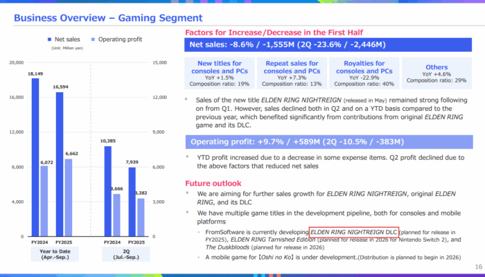 Le groupe compte capitaliser sur la très lucrative franchise qui, malgré le poids des années, ne semble pas faiblir et maintient de bons résultats (+9,7 %) grâce à Elden Ring: Nightreign. On apprend, au détour d’une discrète ligne, qu’un nouveau DLC est en préparation et que sa sortie est prévue avant avril 2026. KADOKAWA mise également sur le lancement de la version Switch 2 d’Elden Ring: Tarnished Edition, dont la fenêtre de sortie reste fixée à 2026, tout comme celle de The Duskbloods.