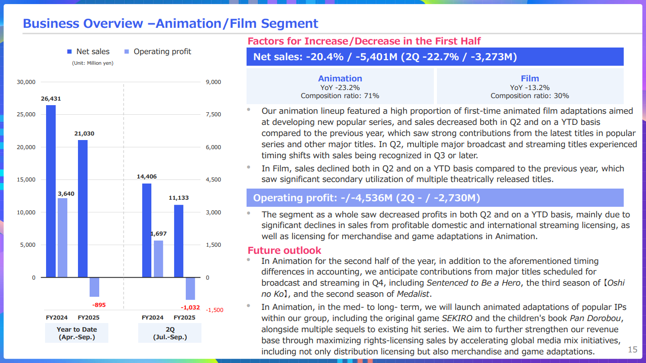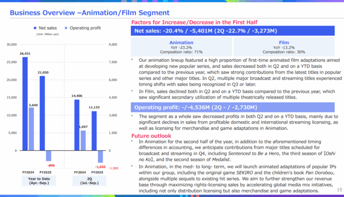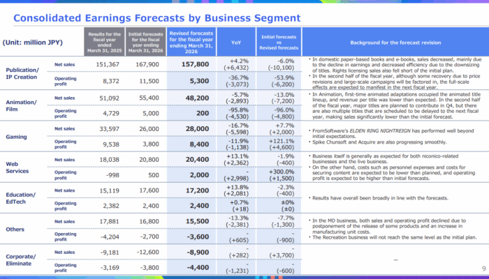 La maison-mère de FromSoftware, KADOKAWA Corporation, a publié ses résultats pour le second trimestre de l’exercice 2025, faisant état d’un recul marqué : le résultat opérationnel et le bénéfice net affichent respectivement -47,8 % et -51,8 %. Les segments Publication/IP Creation et Animation/Film, pourtant piliers historiques du groupe, sont ceux qui ont le plus souffert, en grande partie à cause du report de plusieurs titres majeurs à la prochaine année fiscale.