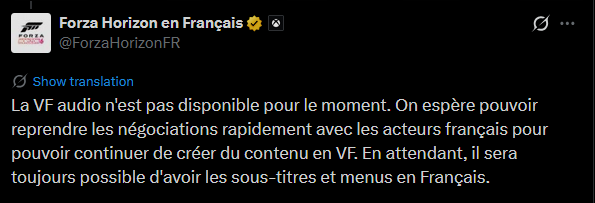 Tout a commencé avec l’ouverture des précommandes de Forza Horizon 6. Des joueurs aux aguets ont rapidement remarqué l’absence de la mention « Audio : Français » sur la fiche Steam du jeu. Le couperet est tombé peu après : via un tweet, le compte officiel a confirmé qu’aucun doublage VF n’était prévu pour le moment. Un coup dur pour une licence qui nous avait habitués à une immersion totale.