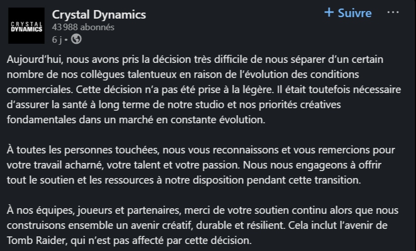 Nouveau coup dur donc pour Crystal Dynamics qui se retrouve dans l’œil du cyclone. D’un côté Embracer, qui cherche à dégraisser son portfolio après avoir racheté des studios à tour de bras, de l’autre Xbox qui, de part l’annulation du projet Perfect Dark, met par effet de bord en péril financier le studio américain. Cette potentielle reprise par Take-Two était en quelque sorte la dernière chance pour tenter de sauver les meubles et cette nouvelle déconvenue a pour effet direct de provoquer une nouvelle vague de licenciement chez le développeur…