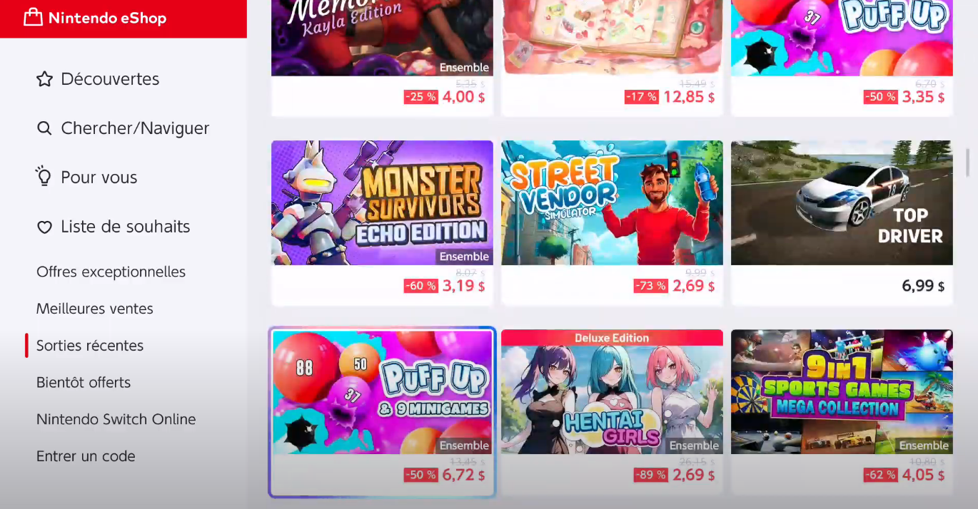 Qu’il est triste de voir que, pour le jour du lancement (et même encore aujourd’hui par ailleurs), sur les dix premiers jeux présents sur l’eshop, trois jeux « Hentai », évidemment déconseillés aux plus jeunes étaient disponibles à l’achat. On y retrouve aussi tous ces « shovelwares », ces jeux faits à la va-vite, souvent à l’aide d’IA générative, qui continuent de saturer le store. On s’inquiétait de la recrudescence de ces arnaques ces derniers mois, espérant que Nintendo intervienne concrètement pour endiguer ce problème, mais force est de constater que ce n’est toujours pas le cas, dans une indifférence malheureusement générale de la part des nouveaux acquéreurs de la machine.