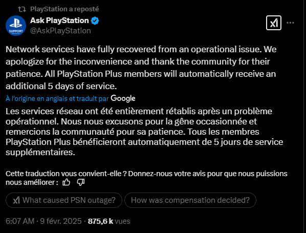 Fort heureusement, la situation n’a pas autant duré et dans la nuit, les services sont petit à petit revenus à la normale. Il semblait d’ailleurs inimaginable que cela puisse perdurer plusieurs jours tant les enjeux sont aujourd’hui infiniment plus important qu’à cette époque. Des enjeux financier pour PlayStation vis à vis de leurs utilisateurs, évidemment, mais aussi et surtout pour leurs partenaires qui ont aussi subit les conséquences de cette panne du PlayStation Network (Activision avec Call of Duty, Epic Games avec Fortnite, Rockstar avec GTA Online…).
