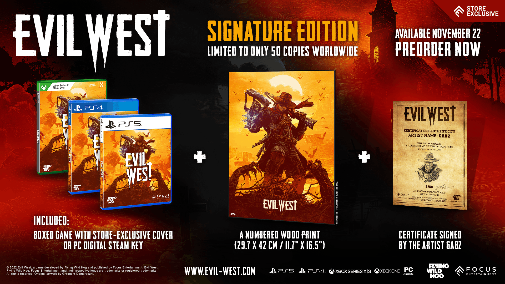 Les éditions collectors. Elles sont souvent la cible de bien des fans, qui ne laissent jamais passer une occasion de se les procurer. C’est pourquoi les équipes de Focus Entertainment ont annoncé aujourd’hui la sortie prochaine d’une édition dite Signature pour leur jeu Evil West. Il s’agit d’une édition ultra-limitée. Seuls cinquante exemplaires sont disponibles dans le monde. Ce petit bijou est venu accompagner le nouveau trailer, et l’édition Signature contient les objets suivants :