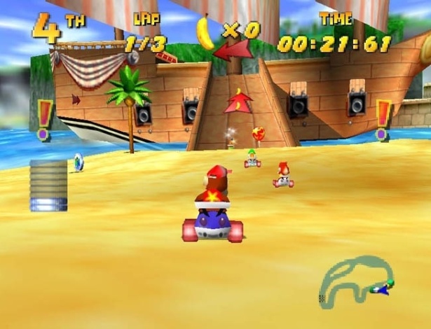 Le studio poursuit aussi l’aventure Donkey Kong avec Donkey Kong 64, le tout premier jeu à nécessiter l’utilisation de l’Expansion Pak, qui permet d’améliorer les performances de la console. Puis Rare ose un pari fou : concurrencer Mario Kart, l’une des licences les plus fortes de Nintendo, avec Diddy Kong Racing. Un Mario Kart-like qui parvient à se faire une place à ses côtés, grâce à des idées novatrices qui inspireront de nombreux jeux par la suite : trois types de véhicules (voiture, hovercraft, avion), une aventure solo scénarisée avec un hub central, des défis, des boss et un multijoueur à 4 avec des objectifs variés