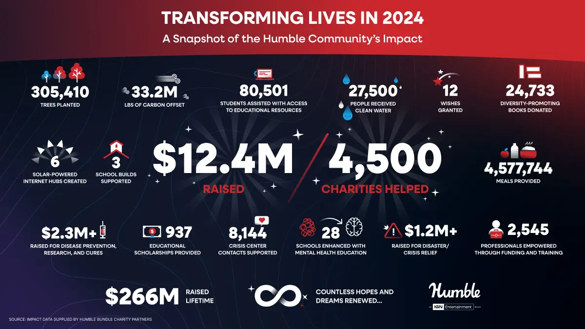 Pour l’année 2024, ce ne sont pas moins de 12,4 millions de dollars (environ onze millions d’euros) qui ont été collectés et redistribués grâce à l’oeuvre collective d’Humble Bundle, des éditeurs associés et bien évidemment des utilisateurs du service. Avec cet argent, ce ne sont pas moins de quatre-mille-cinq-cent oeuvres de charités qui ont été accompagnées l’année dernière, changeant la vie de milliers de personnes à travers le monde.
