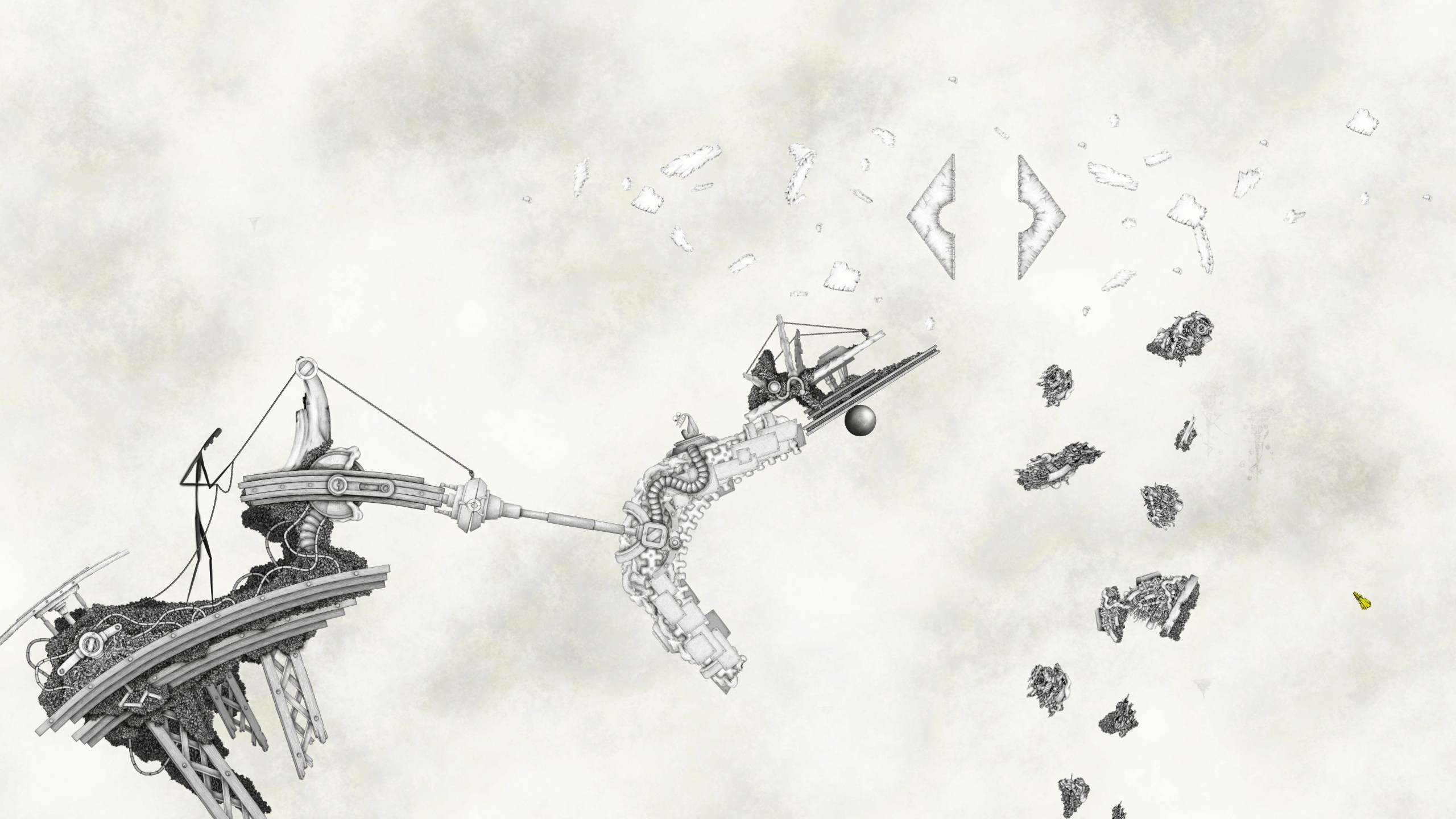 J – Cela varie énormément d’une création à l’autre, des intentions, de la matière initiale, du type de jeu, d’outils. Dans Micromega on utilise la physique dans nos puzzles. Seulement l’univers de Mani est figé. Il a donc fallu imaginer ce mouvement et jouer avec l’aspect “réaliste” du moteur de jeu, l’aspect plausible des règles physiques devant être instantanément comprise par le public mais également la symbolique et les règles inhérentes au monde dessiné par Mani.