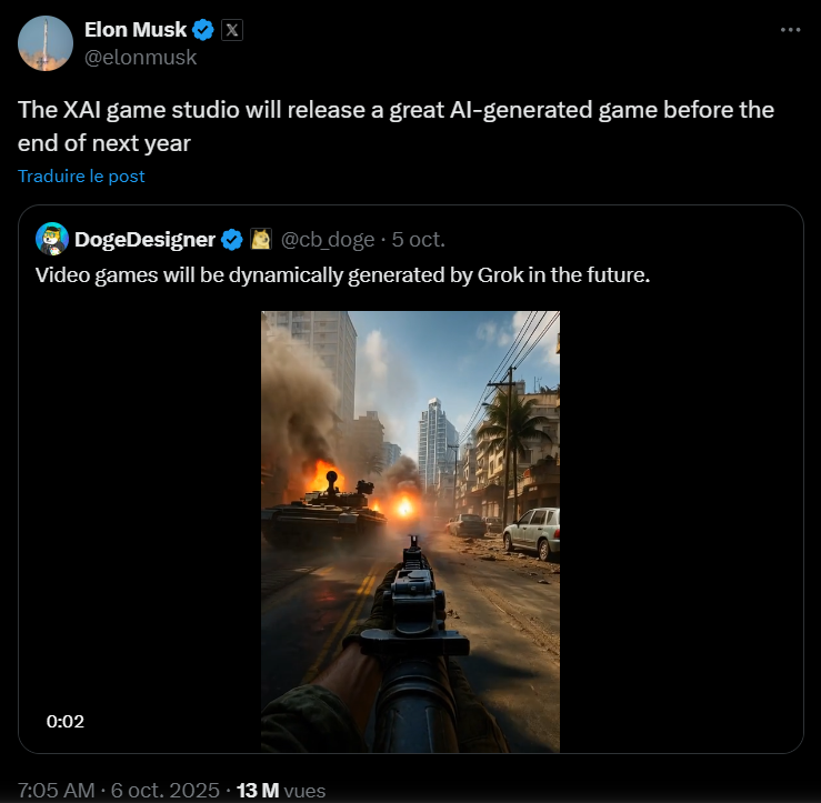 Depuis le lancement de xAI, la boîte d’intelligence artificielle de Musk, son empire ne cesse de s’étendre. Grok, son modèle de chatbot censé rivaliser avec ChatGPT, s’est vu ajouter des fonctionnalités de génération d’images avec Aurora, puis plus récemment, la possibilité de générer des vidéos avec Imagine. Le projet de « xAI game studio » reste flou, mais au rythme où vont les choses, on imagine facilement un développement rapide.