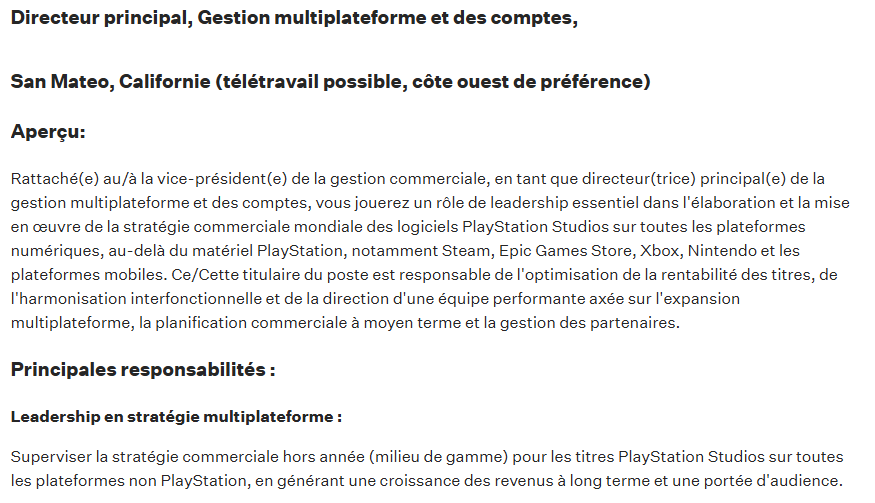 En effet, une offre d’emploi de la part de PlayStation a été repérée dont l’objet est « l’élaboration et la mise en œuvre de la stratégie commerciale mondiale des logiciels PlayStation Studios sur toutes les plateformes numériques au-delà du matériel PlayStation, notamment Steam, Epic Games Store, Xbox, Nintendo et les appareils mobiles ». Et si l’adaptations des grands succès du constructeur sur PC est devenue une habitude un ou deux ans après leurs sorties, la présence de Nintendo et Xbox au sein de cette stratégie est beaucoup plus surprenante.