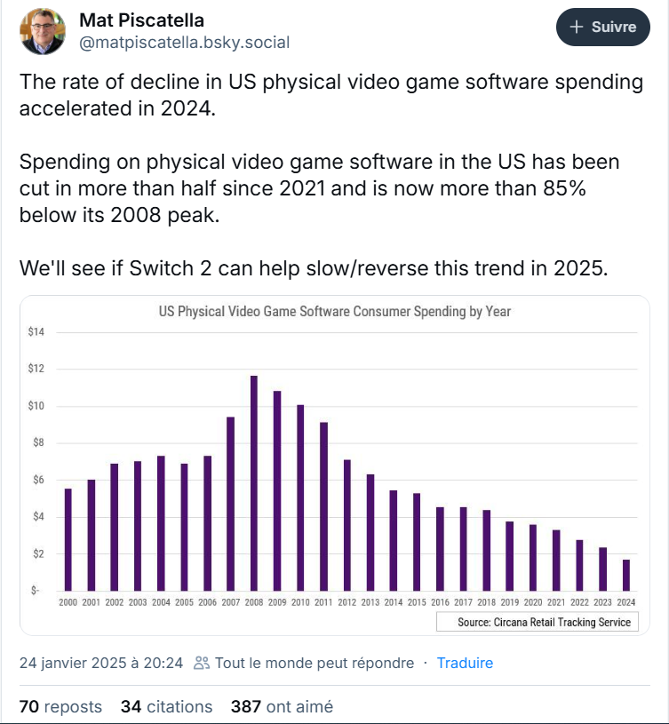 Le marché des jeux vidéo dématérialisés a définitivement le vent en poupe aux USA. Les ventes physiques baissent en 2024 de 50% depuis 2021, et de 85% depuis son pic en 2008, la tendance n’aura jamais été aussi nette outre-Atlantique. Celle-ci s’explique principalement par des habitudes de consommation qui évoluent, surtout depuis le Covid-19.