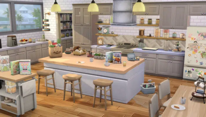 Le kit « Accessoires de cuisine » permet, comme son nom l’indique, de décorer la cuisine de nos Sims ou de leur créer un garde-manger sur mesure. L’objectif est de rendre cette pièce plus vivante et habitée. À part un beau frigo couvert de magnets et un évier, ce sont principalement des objets dans la catégorie « désordre » qui viennent avec ce kit, un peu comme celui sur la salle de bain sorti en 2023. Certains items, comme une pâte à cookies étalée sur le plan de travail ou des boîtes de céréales qui débordent, serviront sans doute plus pour raconter des histoires le temps d’une journée que pour décorer une cuisine de manière permanente. On notera aussi l’effort de proposer des objets fonctionnels comme la tablette qui permet d’accéder aux recettes ou le panier de courses.