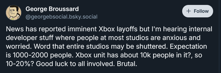 Le développeur vétéran George Broussard (co-créateur de Duke Nukem) a ajouté de l’huile sur le feu sur Bluesky, affirmant que des sources internes évoquent jusqu’à 2 000 suppressions de postes, soit environ 10 % des effectifs Xbox. Selon lui, « des studios entiers pourraient être fermés », ce qui plonge les développeurs dans une incertitude totale.