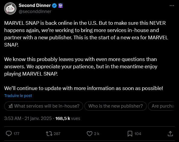 Second Dinner a réagi rapidement à cette crise, qualifiant l’événement de « surprise totale ». Dans un communiqué publié sur les réseaux sociaux, le studio a assuré travailler d’arrache-pied pour que le jeu reste disponible et a annoncé rechercher un nouvel éditeur afin d’éviter toute suspension future :