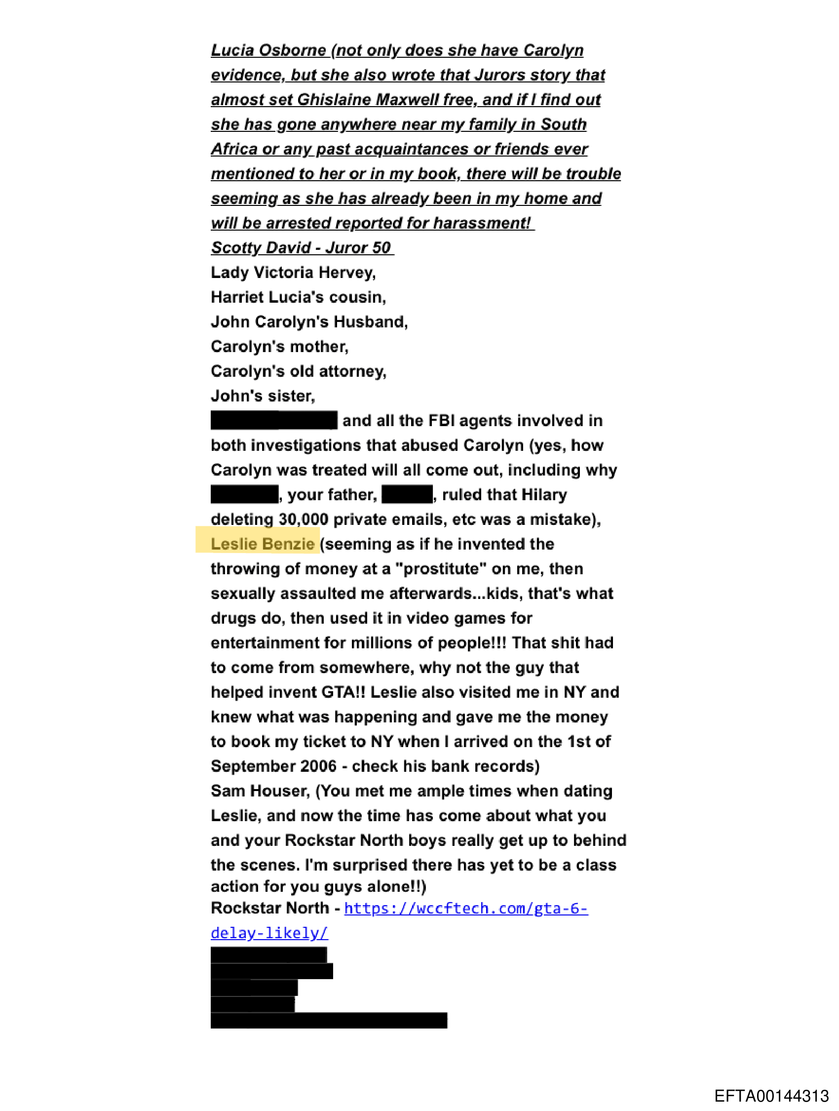 Le nom de Leslie Benzies, fondateur de Build a Rocket Boy et ancien président de Rockstar North, est apparu fin janvier 2026 dans les documents Epstein publiés par le Département de la Justice américain. Il y est mentionné dans des allégations non vérifiées formulées par Sarah Ransome, une survivante d’Epstein qui affirme avoir été en relation avec Benzies au début des années 2000. Build a Rocket Boy de son côté, a confirmé que Benzies reste employé du studio.