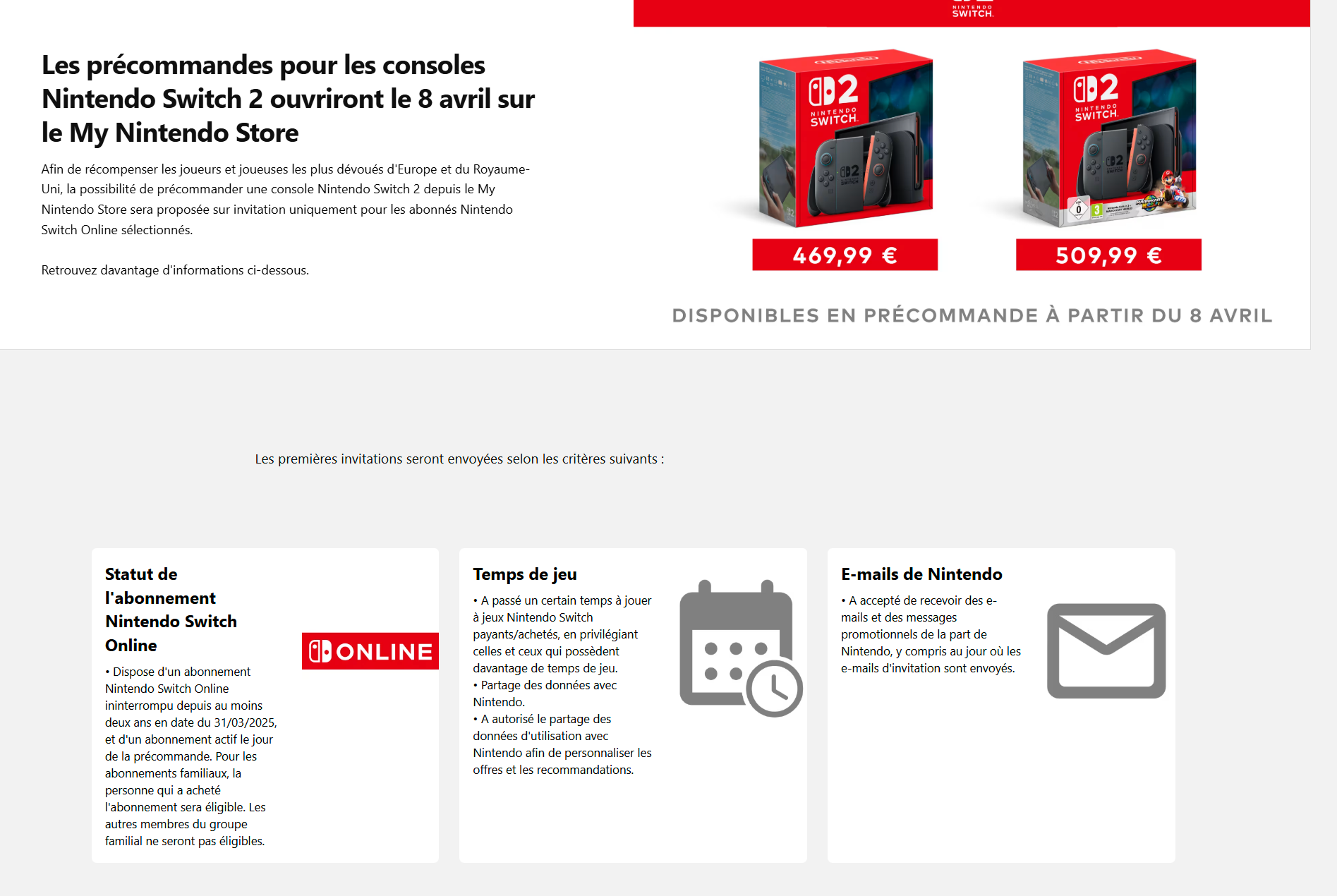 Surtout, celles-ci seront loin d’être ouvertes à tous, ce qui n’est pas sans créer un certain malaise dans la communauté. Nintendo souhaite prioriser ses fans les plus dévoués, et c’est via un système d’invitations que se fera la première vague de précommandes. Plusieurs conditions pour faire partie des heureux élus : être abonné au Nintendo Switch online depuis plus de deux ans à la date du 31/03/2025, avoir joué de nombreuses heures aux jeux Nintendo Switch, et surtout, avoir accepté de partager des informations et de recevoir des mails et messages promotionnels de Nintendo.
