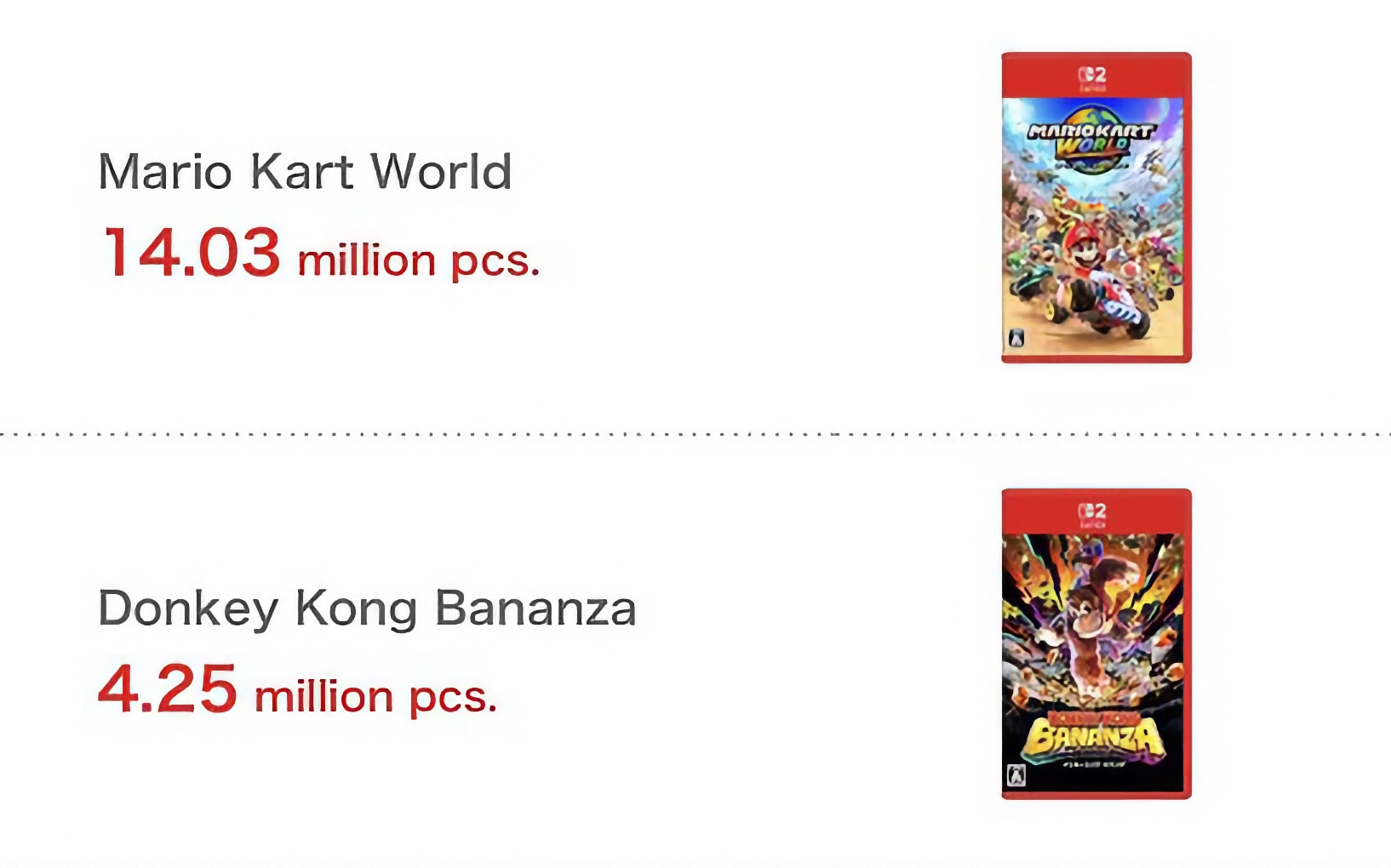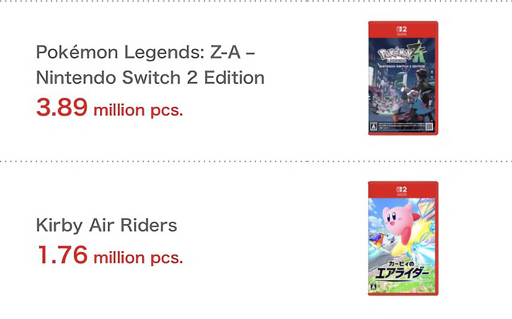 Mario Kart World domine largement avec plus de 14 millions d’exemplaires, un score porté par les ventes en bundle, confirmant néanmoins une fois de plus le rôle central de la série dans la stratégie du constructeur. Derrière, Donkey Kong Bananza, Pokémon Legends: Z-A ou encore Kirby Air Riders s’inscrivent dans une logique familière : des licences reconnues, capables d’accompagner une console sur la durée.