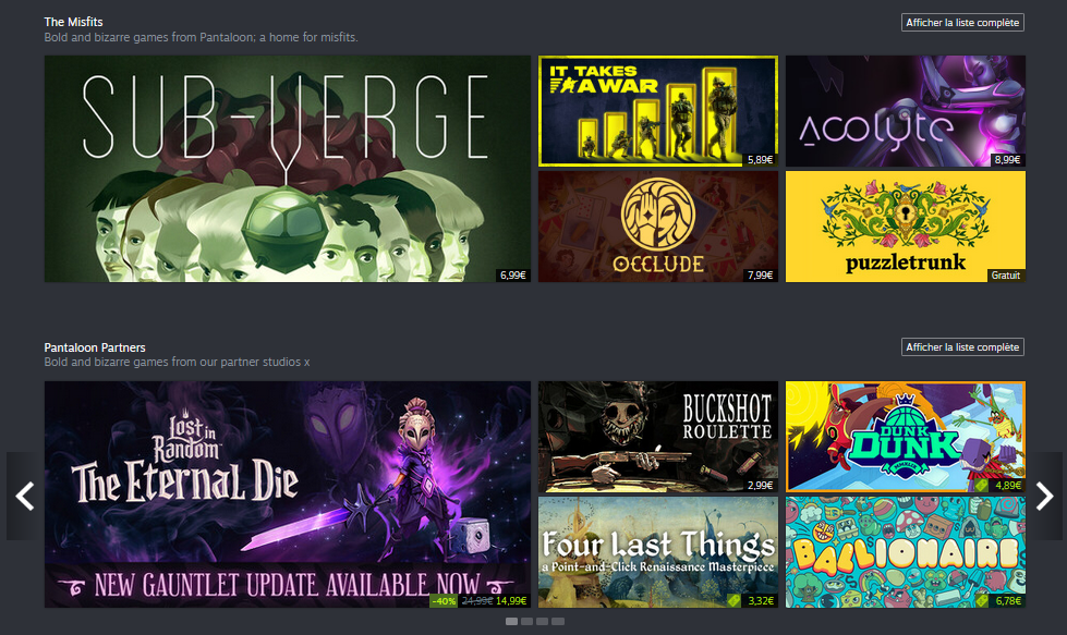 Les partenariats avec des jeux qui ne font pas partie du label Pantaloon existent déjà, comme Lost in Random the Eternal Die (Thunderfull Publishing) ou Buckshot Roulette (Critical Reflex), et d’autres sont à prévoir avec les éditeurs Rawfury (Blue Prince) ou Fellow Traveller Games (Wander Stars).
