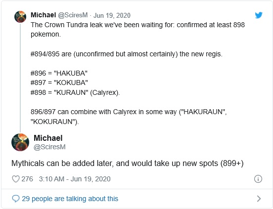 So GF has basically confirmed the Pokémon they plan to add in The Crown Tundra with the dex entries they left out (+/- Mewtwo, Mew, Cobalion, Terrakion, and Virizion, which are already available but not with dex entries) https://t.co/NyhNVG8VPq pic.twitter.com/Nbv27LnBql
