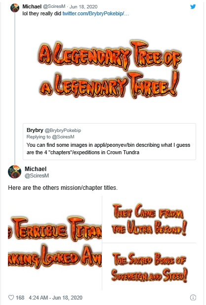 La majorité des nouvelles qui vont suivre ont été déterrées par un dataminer du nom de Sciresm puis partagées par l’intéressé directement sur son compte Twitter. Dès le lendemain de la sortie du premier pack DLC, le bougre partageait déjà une partie de ses recherches. Pour commencer, il aurait trouvé des traces en indiquant plus sur le déroulement du scénario. Si on passera sur les personnages (dont l’usage n’a pas trop de sens jusqu’ici), il précise que ce pan d’histoire sera chapitré et que chaque chapitre fera référence à une vague de Poké-monstres légendaires (les mousquetaires, les golems et les oiseaux élémentaires « lifting Galar »).