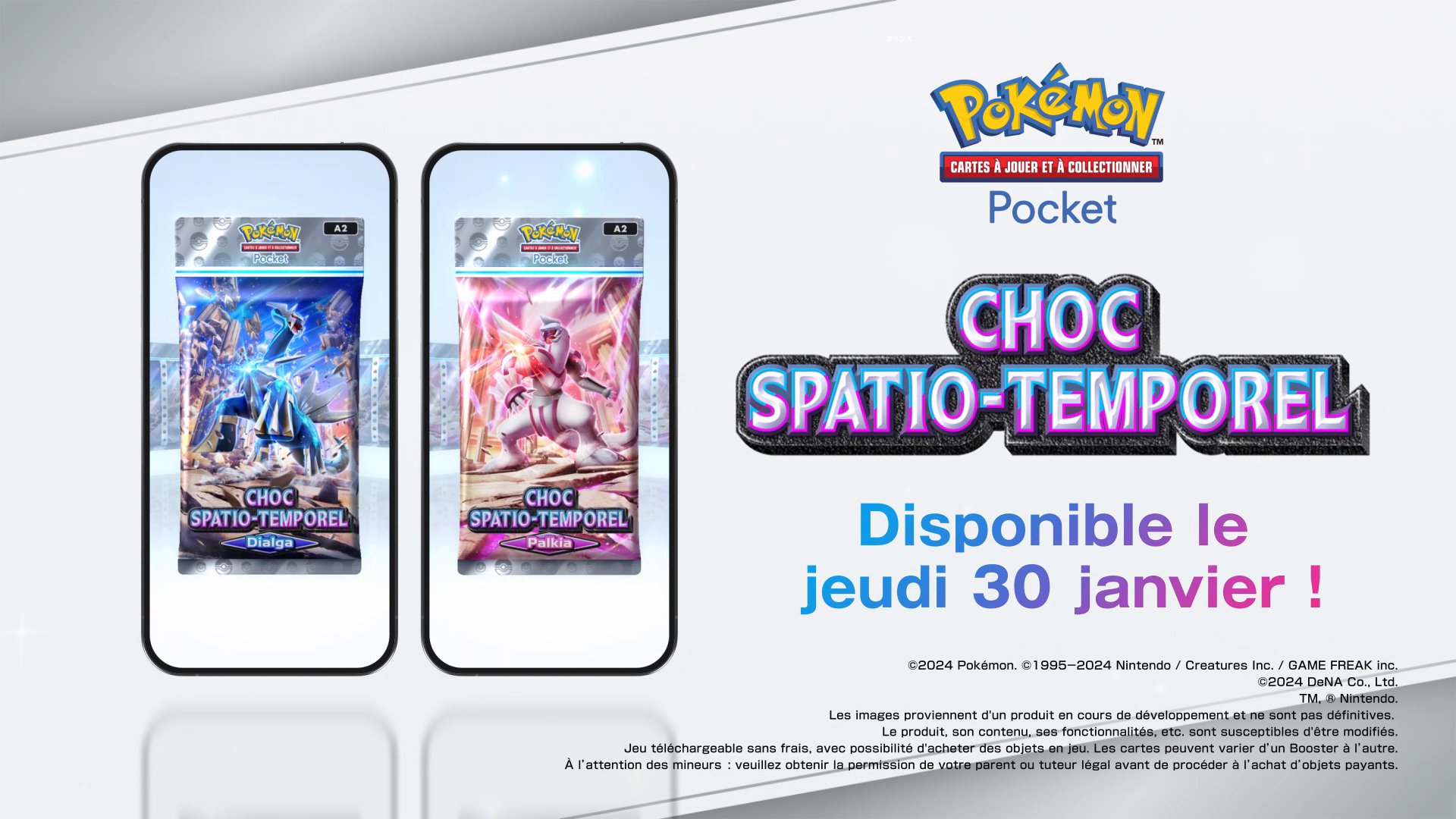 C’est maintenant officiel : la prochaine extension principale de Pokémon TCG Pocket, Choc Temporel, a été annoncée pour le 30 janvier. Elle mettra en avant la quatrième génération avec deux boosters, l’un mettant à l’honneur Dialga et l’autre, Palkia. De plus, The Pokémon Company en a profité pour donner plus d’informations sur la fonctionnalité d’échanges, qui devrait arriver dans le jeu la veille de la sortie de l’extension, soit le 29 janvier.