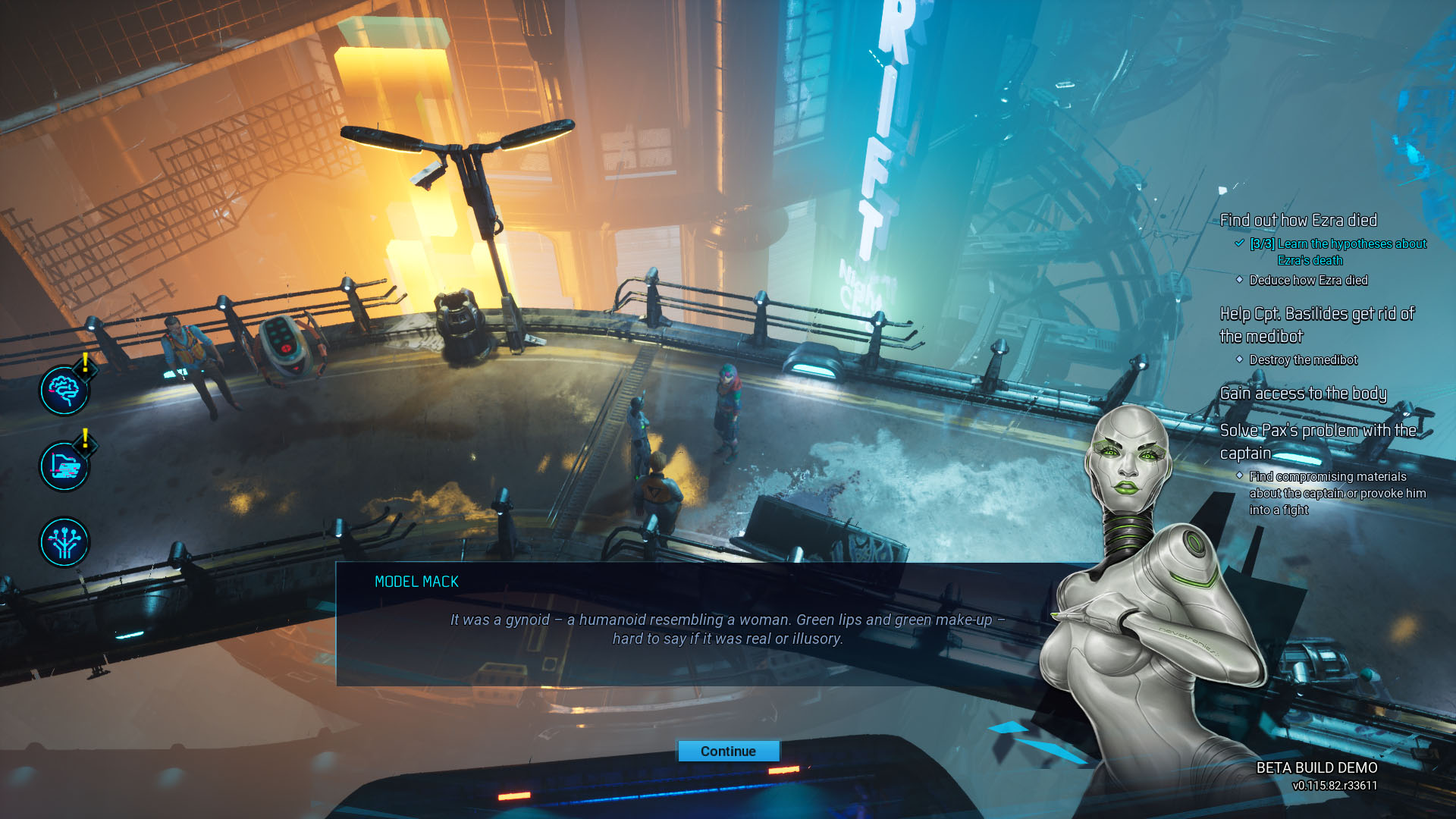 Dans un tout autre univers, celui de la pluie et des néons de Blade Runner, Gamedec reprend néanmoins beaucoup de choses vues dans Disco Elysium : la vue en 3D isométrique, classique du RPG « à l’ancienne », les nombreux dialogues (même si – a priori – un peu moins riches que ceux du jeu de ZA/UM), et le fait que ces derniers puissent influencer à la fois la construction de notre personnage et la suite de l’histoire. L’absence de combat, aussi, rappellera fortement l’héritage Disco Elysium.