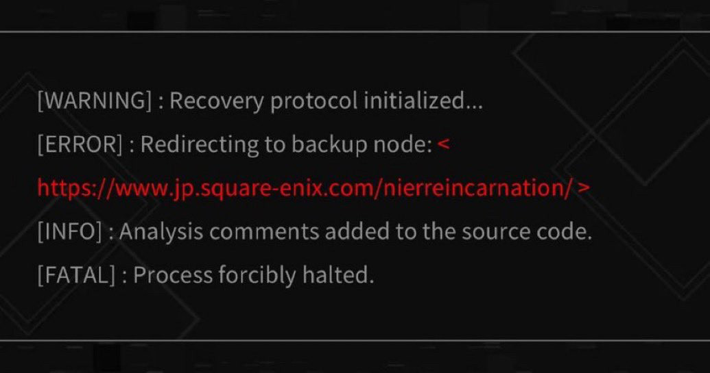 AVIS DE SÉCURITÉ : Transmission non autorisée détectée. Interruption du signal enregistrée. Protocole de contre-mesure actif. Redirection vers le nœud de secours : https://www.jp.square-enix.com/nierreincarnation/