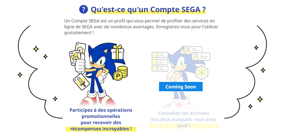 C’est un service probablement semblable à celui que propose Ubisoft que SEGA vient d’ouvrir. Baptisé sobrement SEGA Account (compte SEGA), il promet pour l’instant de « Participer à des opérations promotionnelles pour recevoir des récompenses incroyables », et, dans un futur plus ou moins proche, permettra de « consulter les archives des jeux auxquels vous avez joué ».