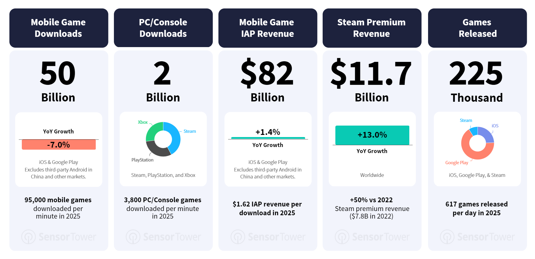 Si le mobile domine toujours largement en volume, la dynamique est très différente sur PC et consoles. Selon le rapport de Sensor Tower, les revenus générés par ces plateformes ont progressé d’environ 13 % en 2025, tirés notamment par les sorties AAA et AA sur Steam.