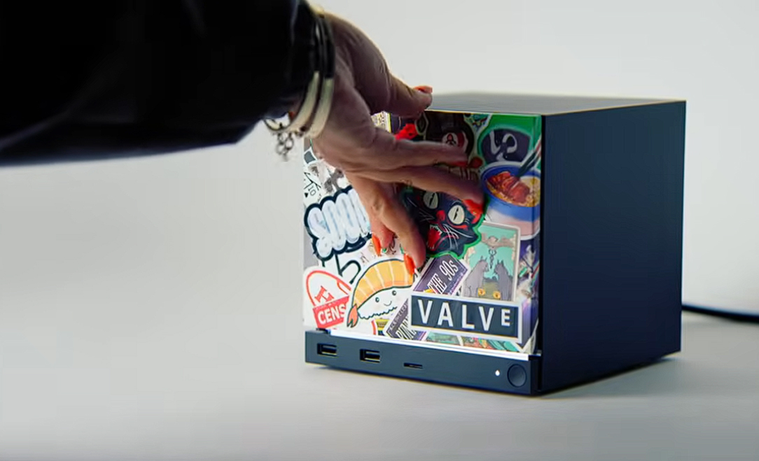 Valve opte par ailleurs pour un form factor réduit, avec un tout petit boitier de forme cubique d’environ 15 cm de côté, avec un éclairage dynamique (une barre LED qui pourrait indiquer différents états : mises à jour, téléchargement en cours ou achevé…), des façades décoratives interchangeables…
