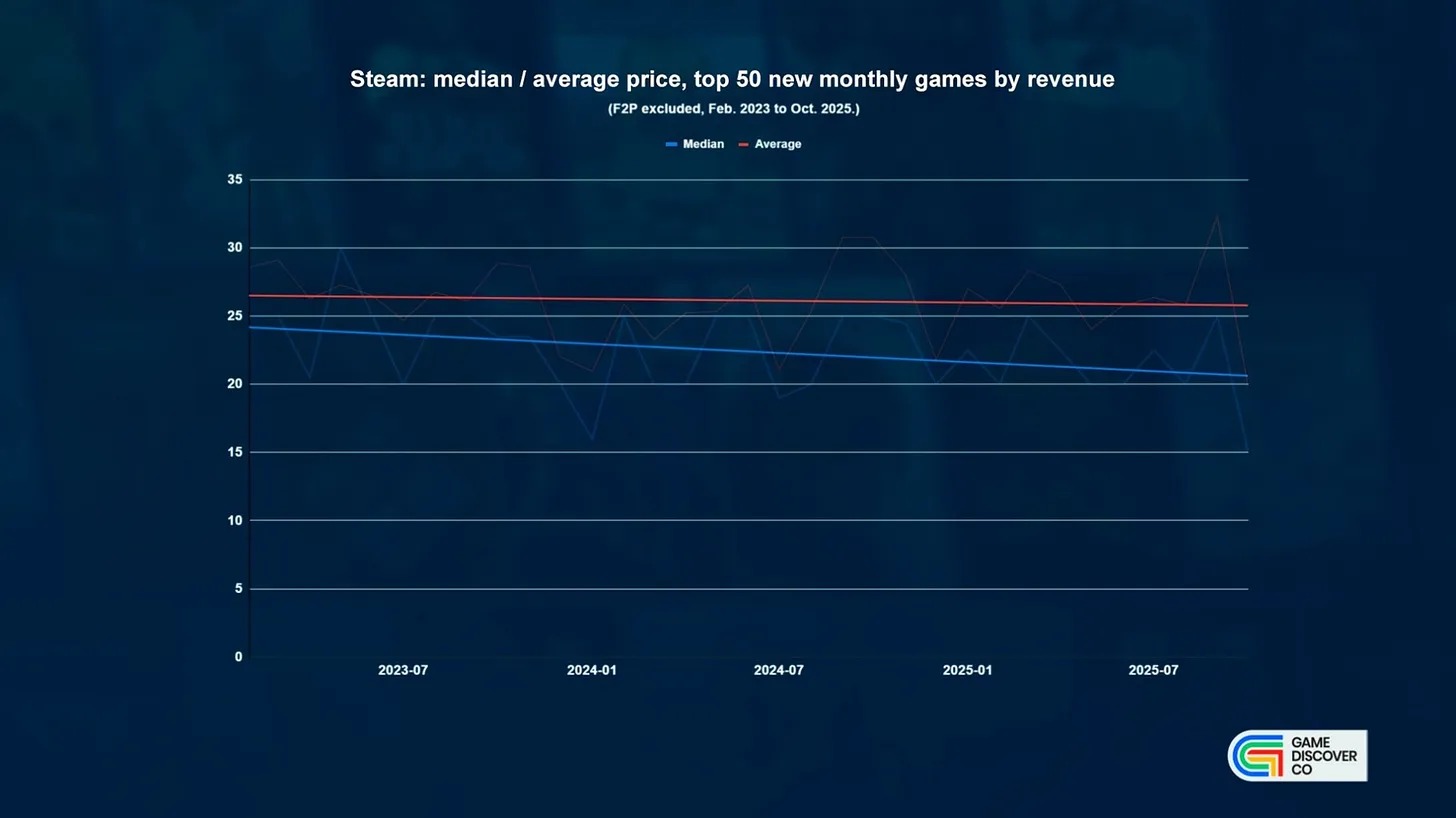 Depuis bientôt 3 ans, le prix médian des jeux vendu sur Steam baisse progressivement. Parti de 19,50$ début 2023, il est désormais à peine au-dessus de 15$, soit une baisse de 20%.