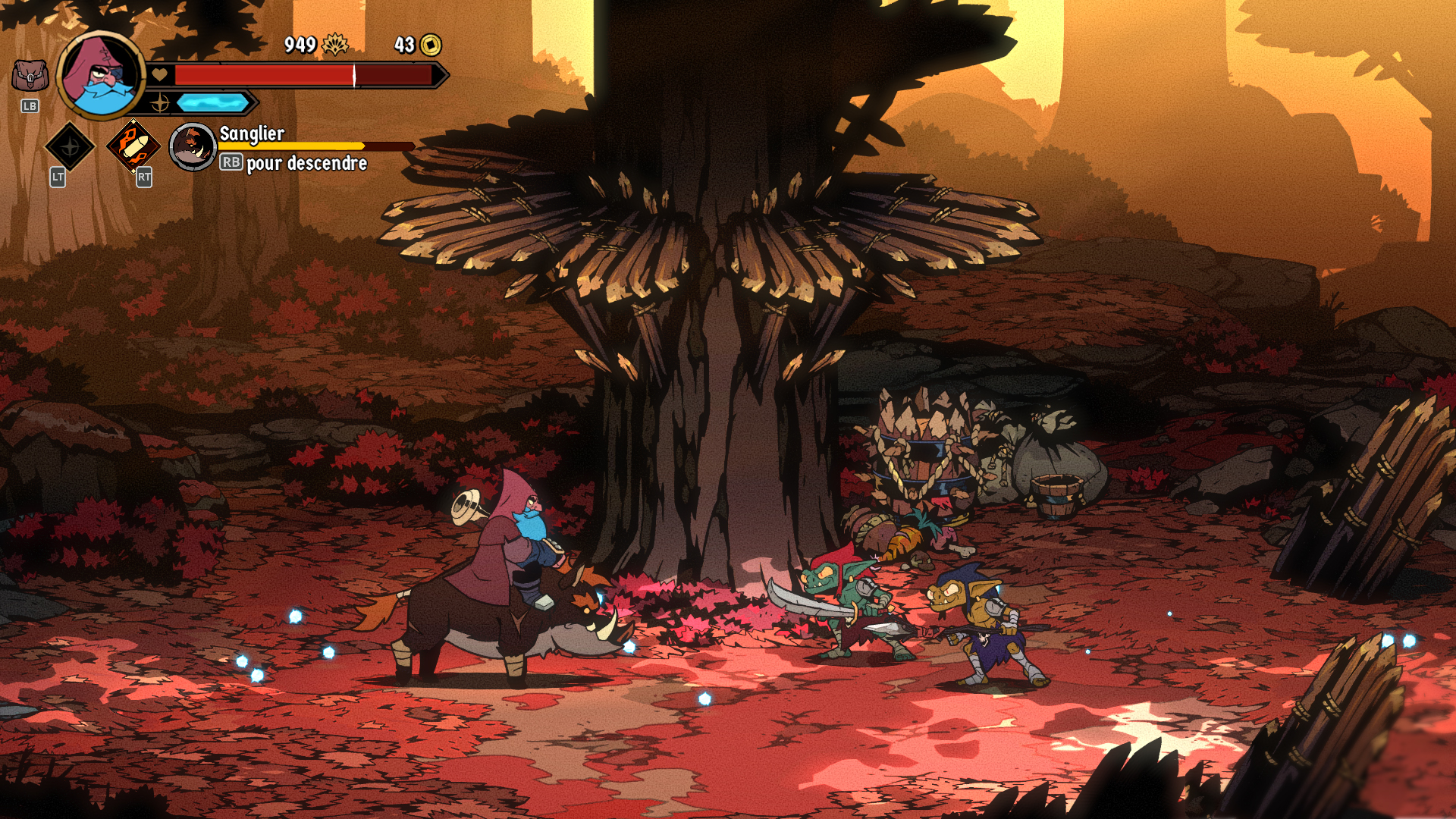 La filiation avec Golden Axe saute rapidement aux yeux, et pas uniquement parce qu’on est face à un beat’em up ayant pour décors un imaginaire fantasy. Certes, pas de barbare en slip ou d’aventurière en bikini (du casting original du jeu de SEGA, il reste le nain barbu), mais bien d’autres points communs viendront nous rappeler qu’Absolum se place bien en héritier de Golden Axe. Parmi les plus évidents, on citera les montures que l’on peut subtiliser aux ennemis pour un temps donné, et le petit personnage qu’il faudra éhontément rosser pour lui subtiliser quelques consommables.