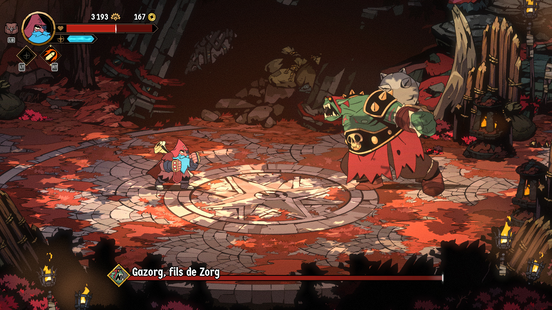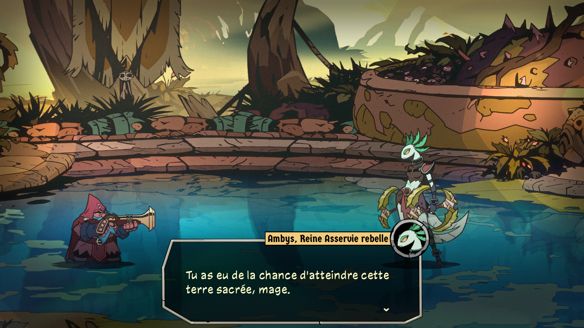 Se faire plaisir avec un univers bien installé, et faire partager ce plaisir, c’est une chose (dans laquelle Dotemu s’est montré plus que compétent) ; développer et imposer son propre univers, c’est un défi d’une tout autre nature. Pour que cette mission connaisse le succès, le paquet a ainsi été mis sur tout ce qui permettra d’être séduit par le monde d’Absolum. Une identité graphique affirmée, une réalisation riche et soignée, avec notamment une animation très réussie et un doublage systématique des dialogues (en anglais ; les sous-titres sont disponibles en français), mais aussi un game system qui permettra de faire connaissance progressivement avec l’univers.