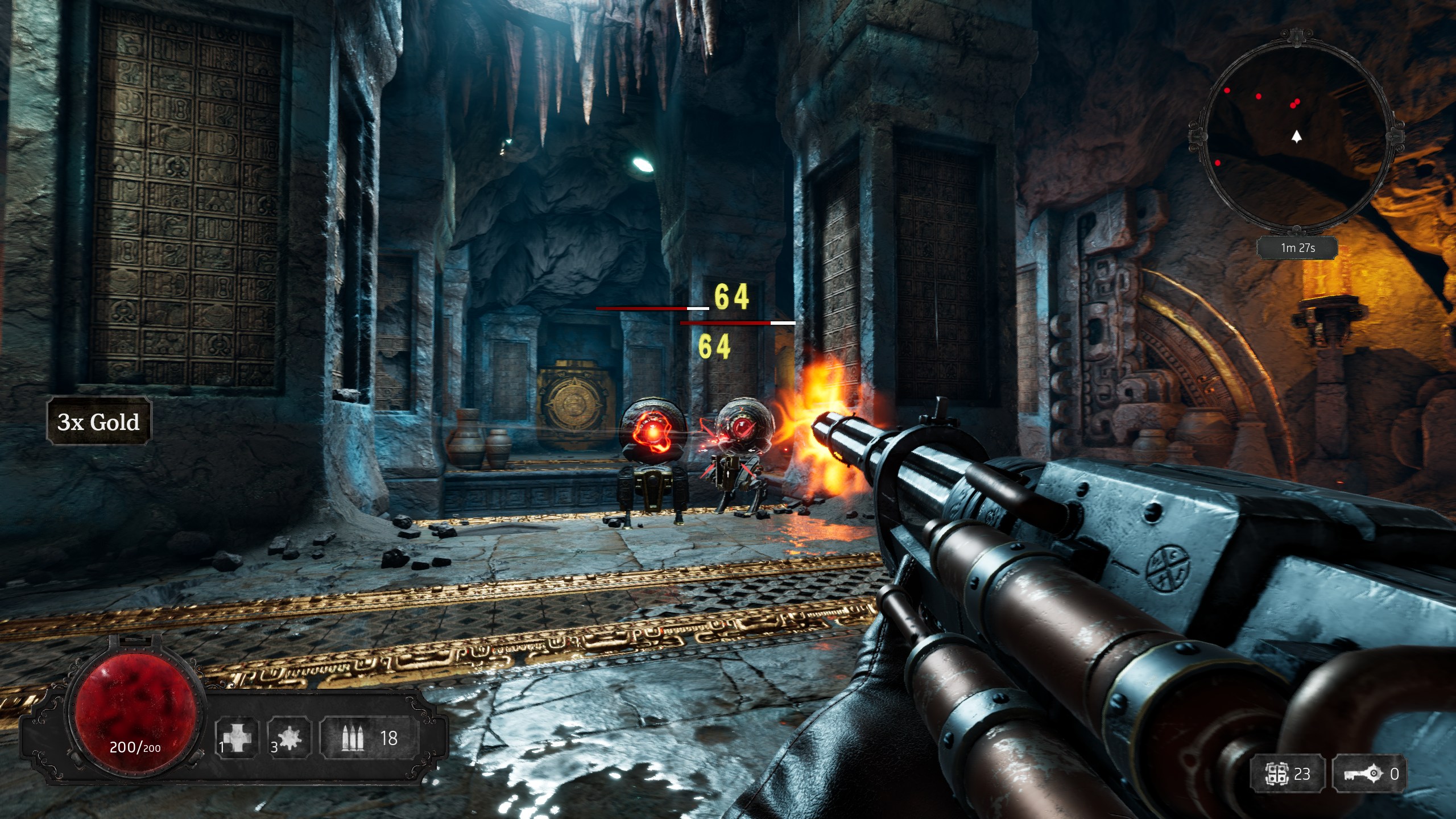 Dans Abyssus, on nous donne une arme automatique, une grenade et on nous présente les différentes façons d’infliger des dégâts, un clic gauche classique, un clic droit dit « spécial » et une capacité (en l’occurrence, la grenade). Et en avant Guingamp. Comme mentionné, le jeu s’inspire de jeux inspirés par l’arena fast fps, comprendre ici qu’on nettoie une salle avant de passer à la suivante et ainsi de suite jusqu’à ce que mort s’ensuive.