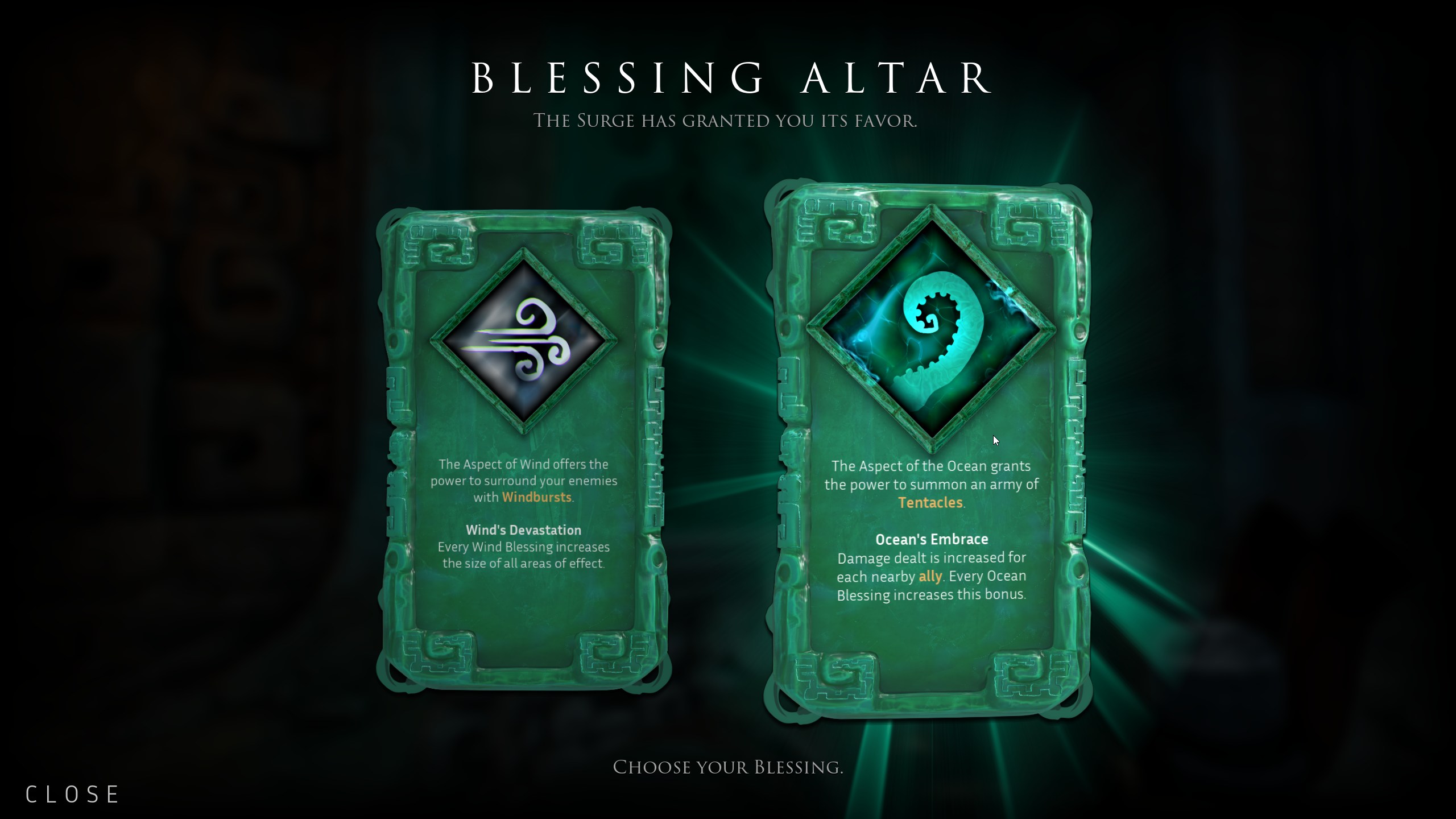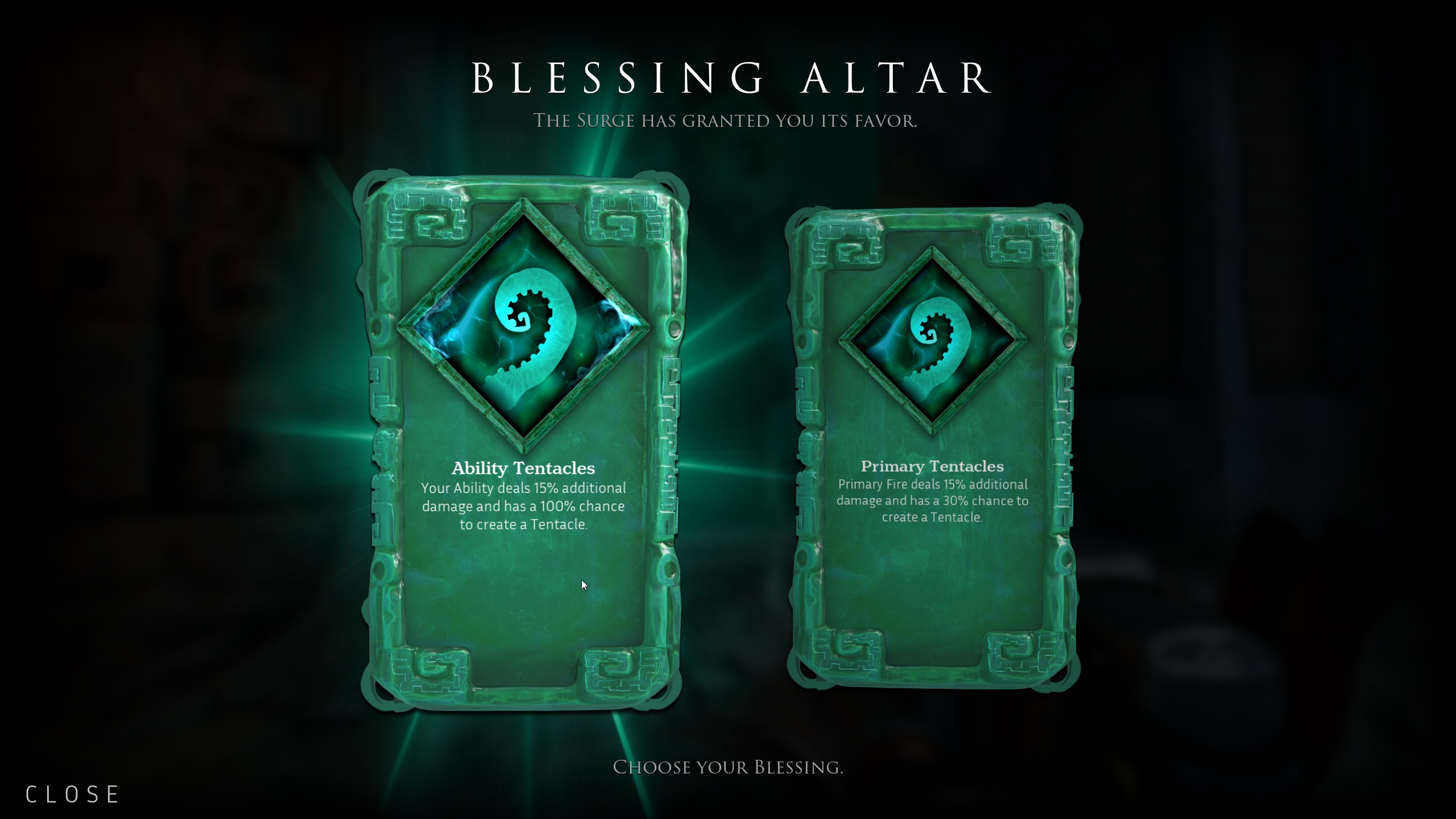 Rattrapons tout de même la surcouche Rogue-like qui est si légère qu’elle était en train de s’envoler. On peut choisir, en arrivant devant un autel à la fin d’une salle, un des deux pouvoirs tirés des 10 qu’on pourrait apercevoir au cours de l’aventure. Chacun de ces pouvoirs est un effet passif et le jeu nous tire encore une fois deux choix parmi les différentes façons d’infliger des dégâts.