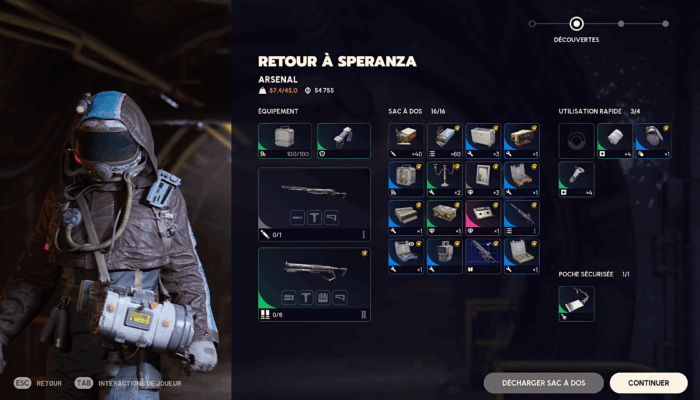 En parallèle de cela, vous aurez également l’opportunité de construire divers établis, vous permettant à leur tour de fabriquer toute sorte d’équipements, que ce soit des armes, des mines lasers ou non, plein de type de grenades, des gadgets de mobilité et bien plus encore. Et pour cela, il faudra ramasser tout un tas de bric-à-brac et réussir à l’extraire, puis le trier selon vos besoins et la capacité de votre réserve. Il faudra ensuite déterminer quoi vendre, quoi conserver ou recycler et ainsi de suite, ce qui nous amène au plus gros point noir de ARC Raiders: l’ergonomie de ses menus. Si Embark Studios semble avoir résolu une bonne partie des problématiques du genre, il n’a pas encore trouvé la formule miracle pour les menus. Prenons l’exemple du hub, Speranza, qui sert de base aux Raiders. Certes, l’endroit est joliment animé, vivant, et regroupe tous les services dont un joueur pourrait avoir besoin. Mais ses menus, eux, auraient bien besoin d’une cure de qualité de vie.