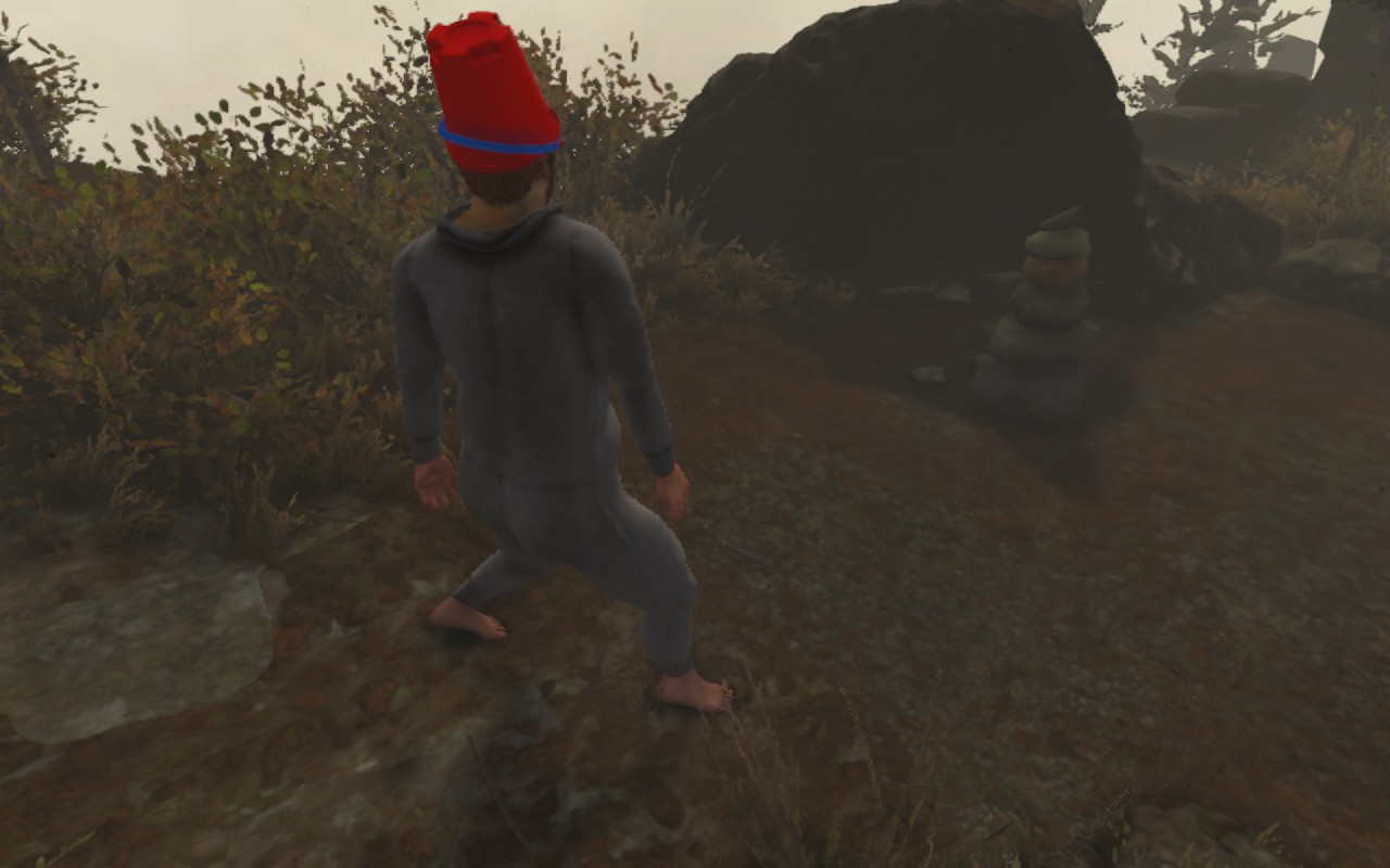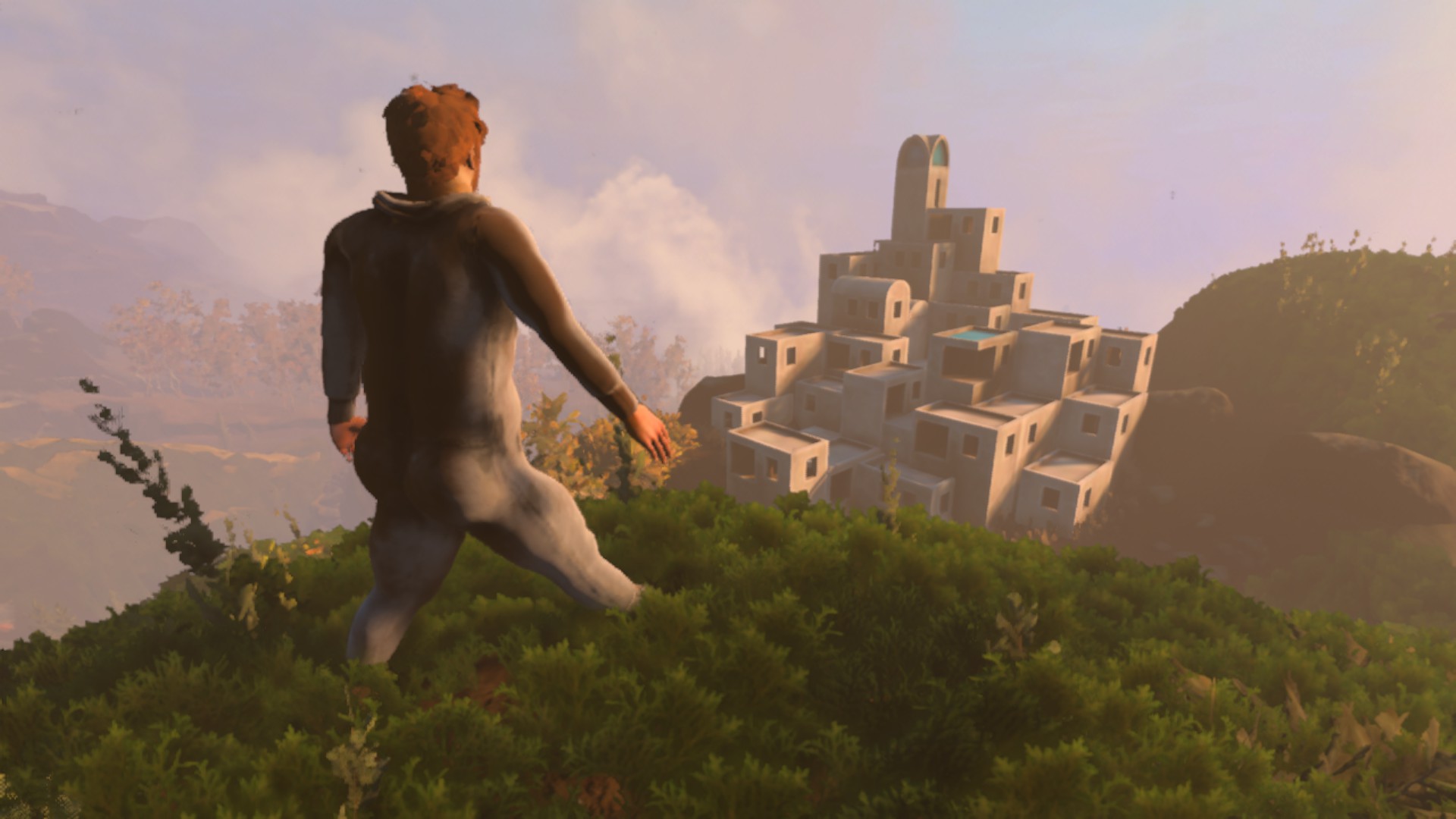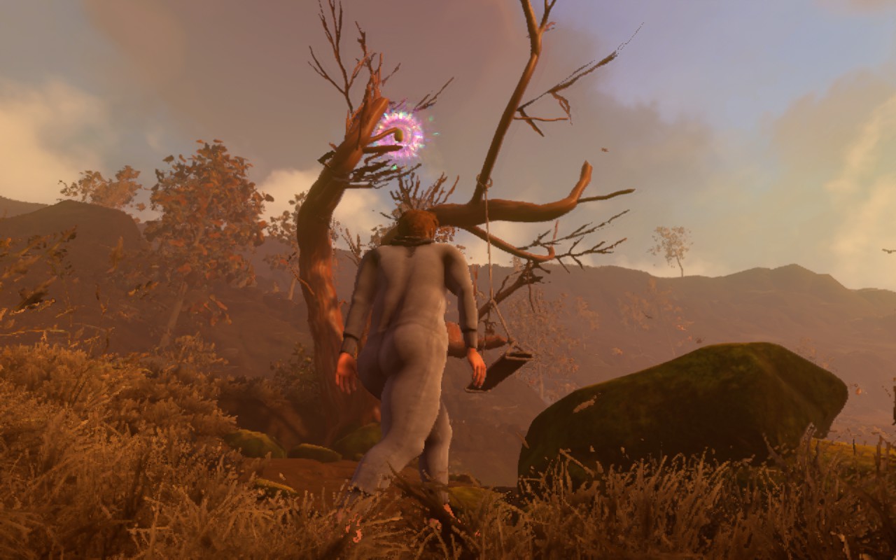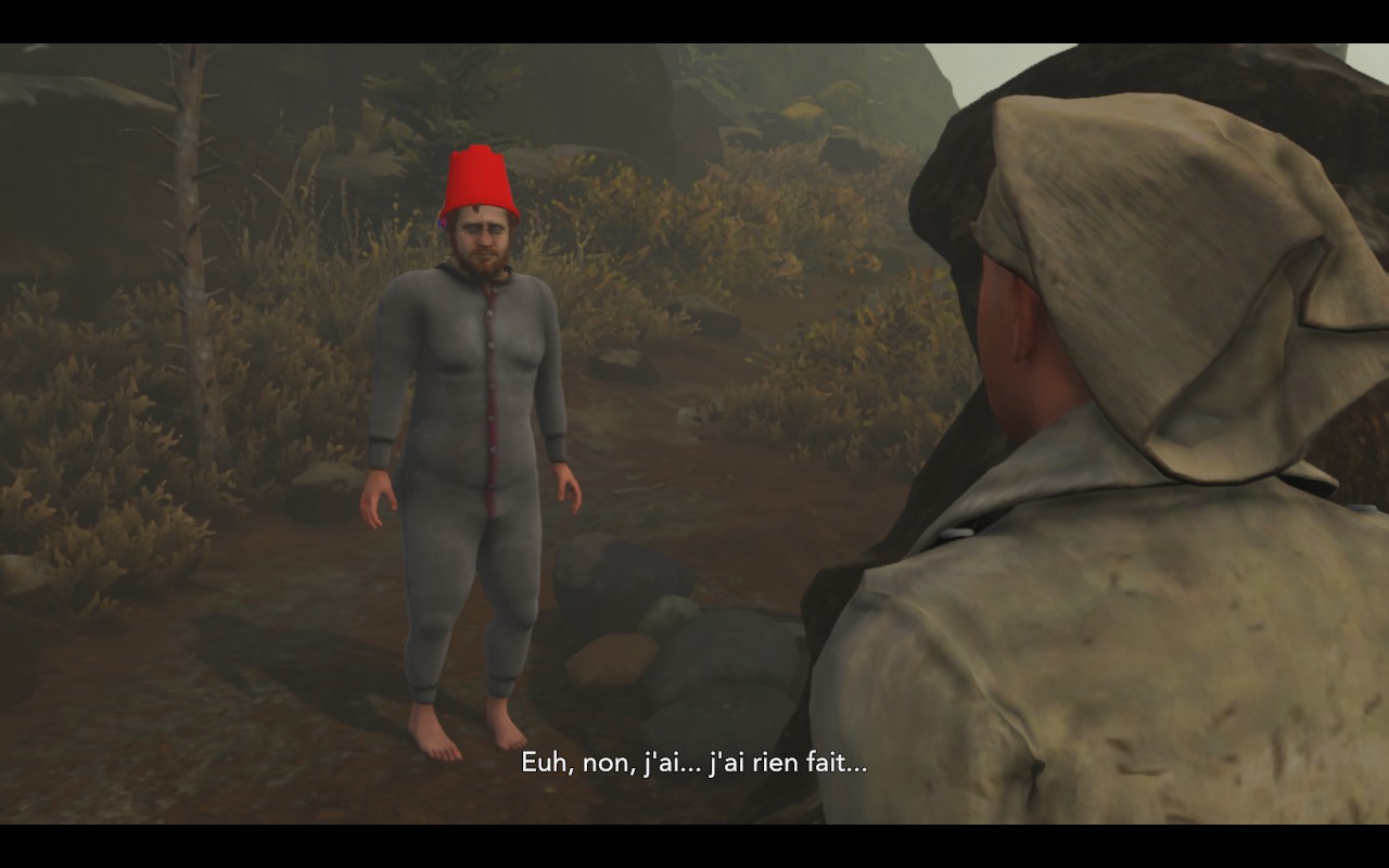 L’univers de Baby Steps est à l’image de son gameplay. Nate n’est pas seulement incapable de marcher, il est aussi socialement inapte. Chaque interaction est un moment de gêne palpable. Un PNJ vous offre des chaussures ? Nate refuse. Un randonneur vous propose une carte qui s’affiche brièvement à l’écran ? Il mettra fin à la conversation, faisant disparaître la précieuse mini-map apparue au cours de la discussion (oui, le sens du détail va aussi loin) et vous laissant à nouveau seul et perdu.