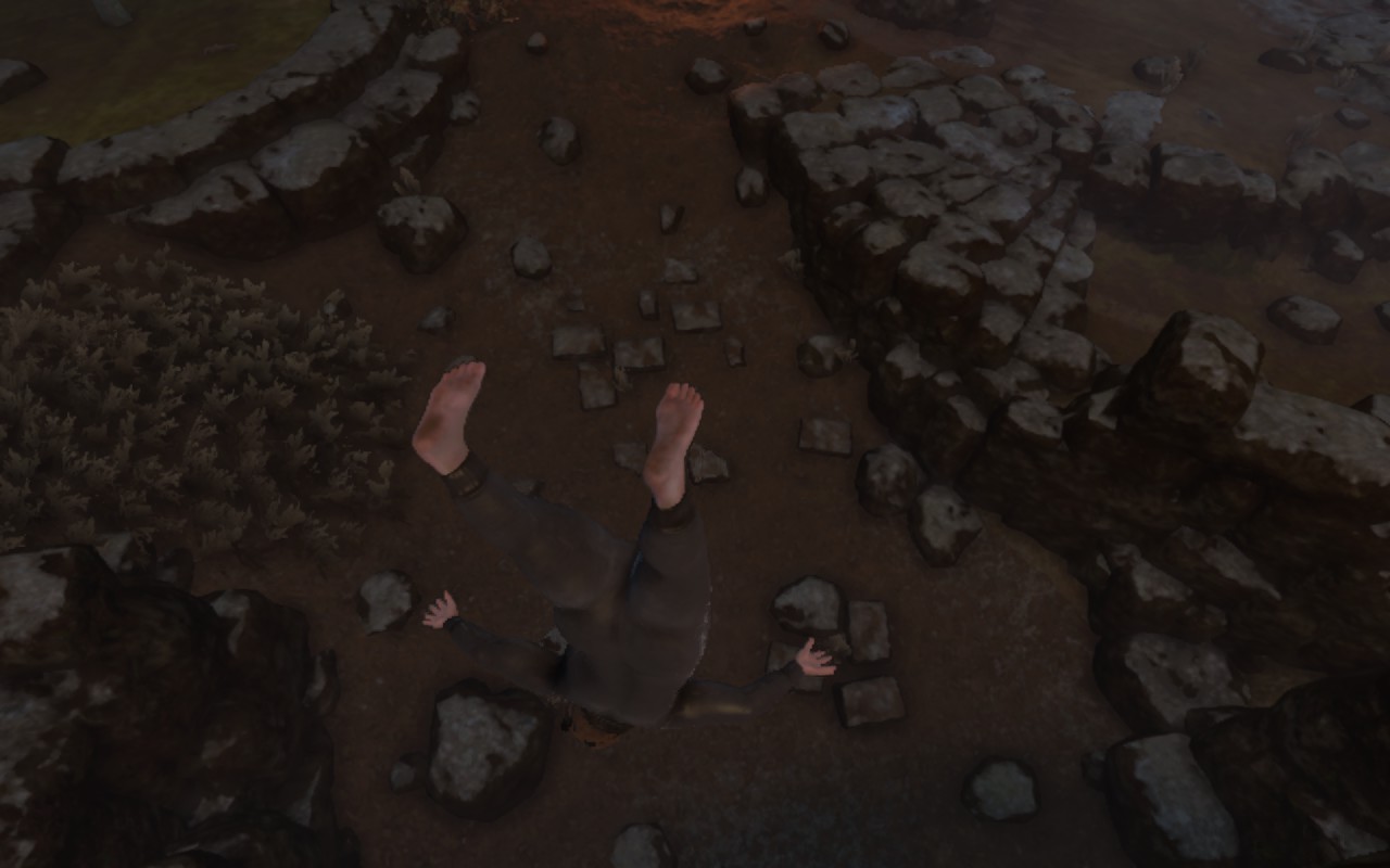 Le jeu fait dans l’excentrique dès les premières secondes. On y incarne Nate, 35 ans, chômeur invétéré vivant dans la cave de ses parents, qui se retrouve soudainement téléporté dans un monde montagneux et hostile. Son seul objectif : marcher. Une tâche qui s’annonce insurmontable pour lui, et qui le deviendra très vite pour le joueur. À peine relevé, une gâchette pour chaque jambe et un stick pour l’équilibre, on tente un premier pas… et c’est la première chute. Elle sera loin d’être la dernière, et encore plus loin d’être la pire. Le titre du jeu est d’une justesse absolue : on progresse dans le jeu à petits pas (littéralement), et on progresse en compétence de la même manière.