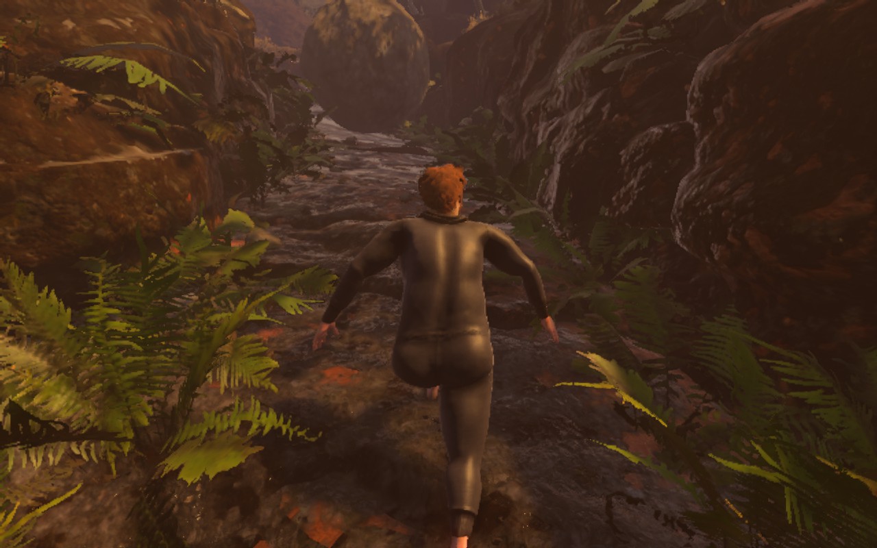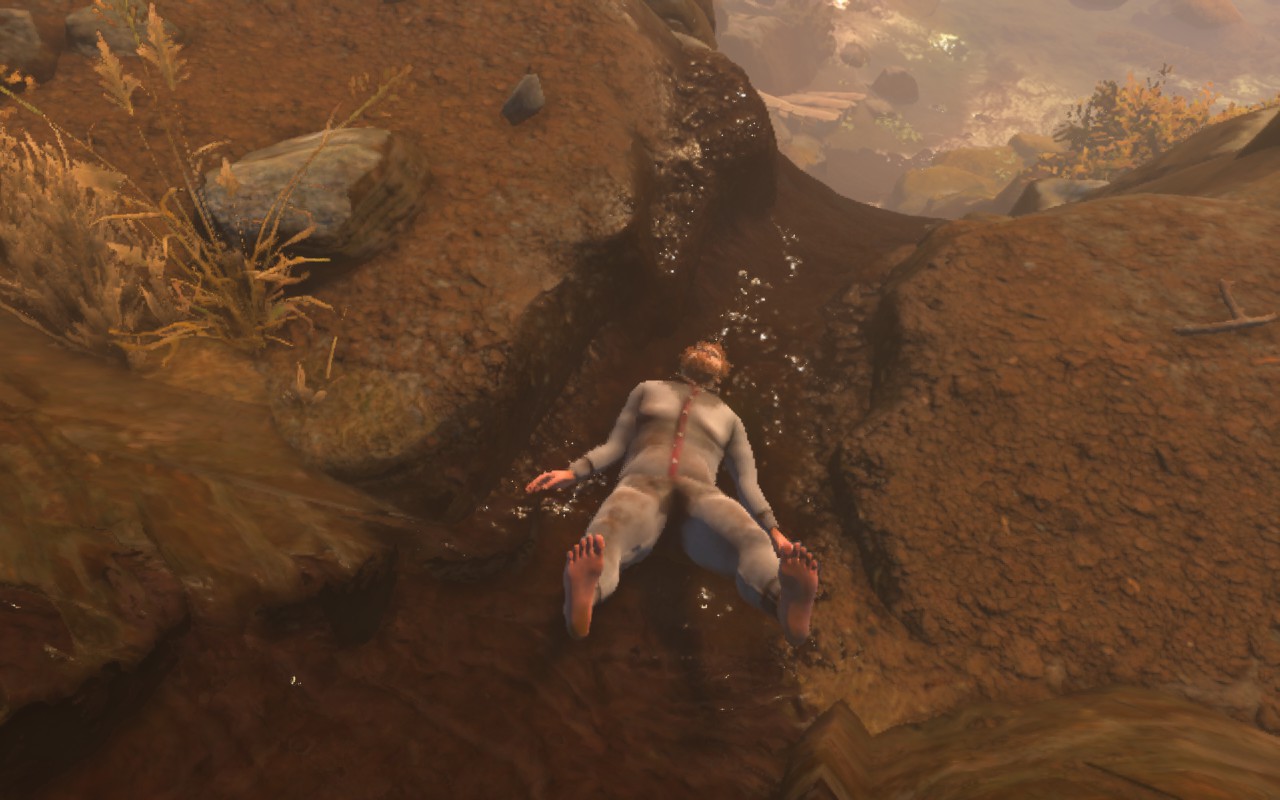 Le gameplay est aussi minimaliste qu’exigeant. Pas de compétences, pas de raccourcis, juste vous et vos deux jambes. La grande réussite de Baby Steps est de nous faire réapprendre un geste que l’on croyait inné. Vos premiers pas seront chancelants, vos premières minutes pathétiques. Puis, un semblant de rythme s’installe, on enchaîne quelques mètres et on se surprend à penser « ce n’est pas si difficile ». Grave erreur. Et Baby Steps viendra vous le rappeler à chaque fois, il ne faut pas prendre la confiance. Même en fin de jeu, on continuera de trébucher sur du plat en étant trop ambitieux. Le parcours ne fait que commencer, et chaque nouvelle texture de sol (boue, neige, mousse, etc ..) vient perturber votre démarche déjà précaire.