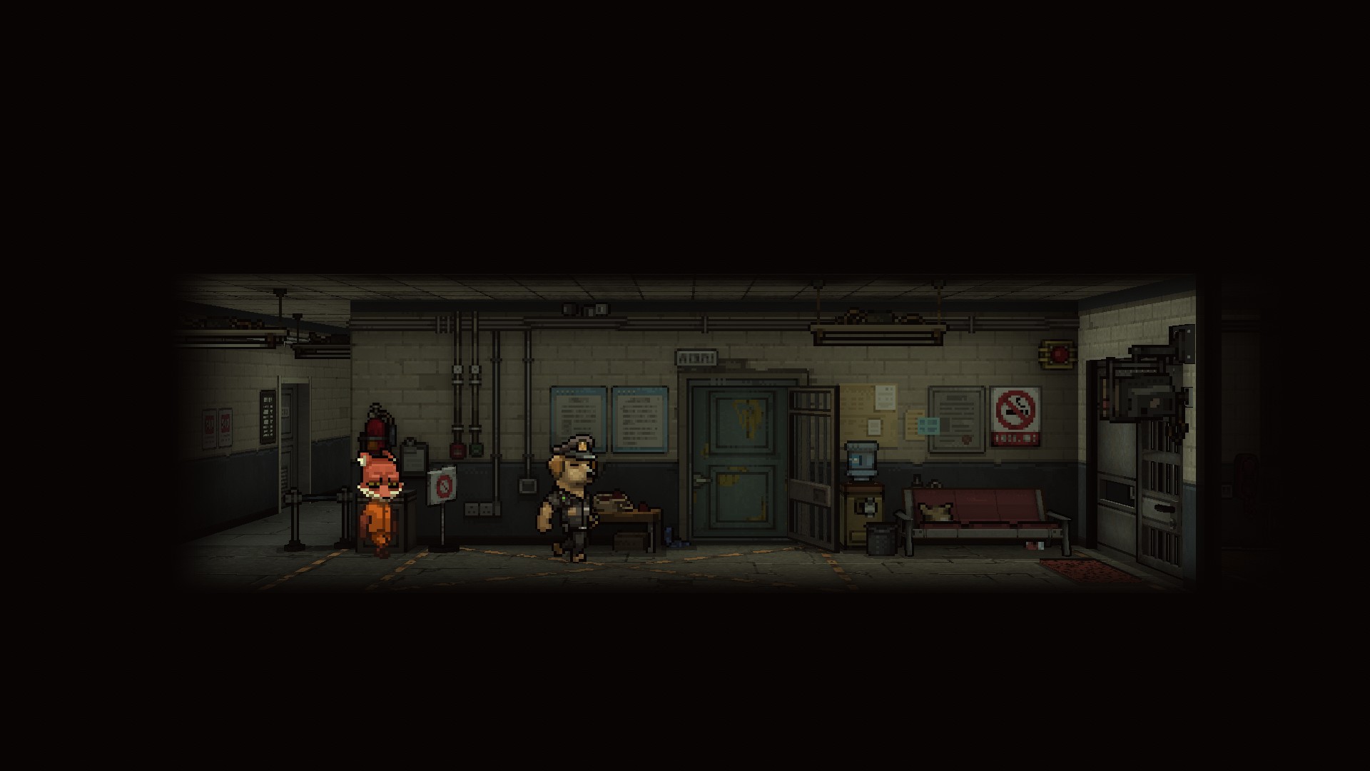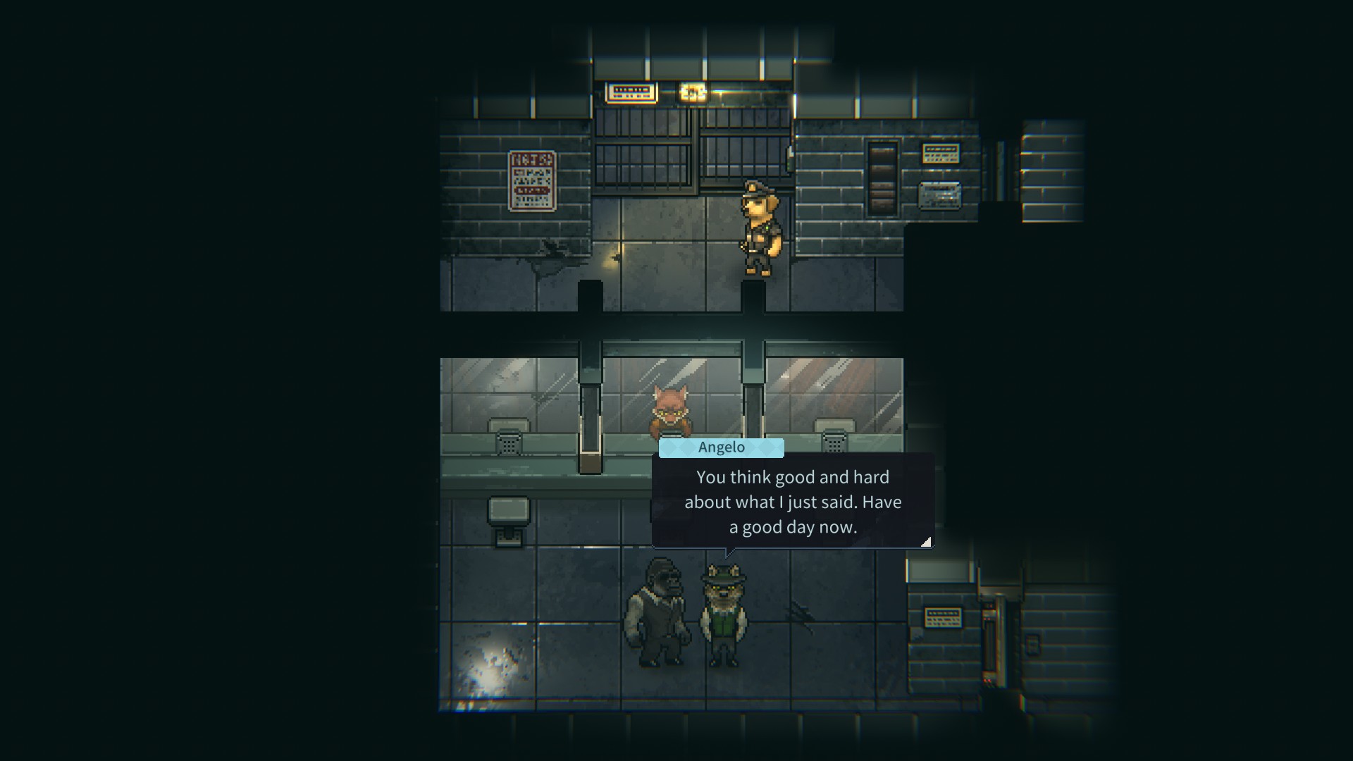 On ne l’a pas précisé jusqu’ici (les captures d’écran l’auront fait pour nous), mais le jeu met en scène une galerie d’animaux anthropomorphisés, et adopte un style pixel art. On pense alors évidemment à Blacksad. Comme dans les aventures du chat détective, la race de chaque personnage révèle une partie de sa personnalité. Les gardiens seront ainsi des chiens de garde, le kangourou sera un boxeur hors-pair, quand notre personnage de journaliste d’investigation sera, lui, un renard…