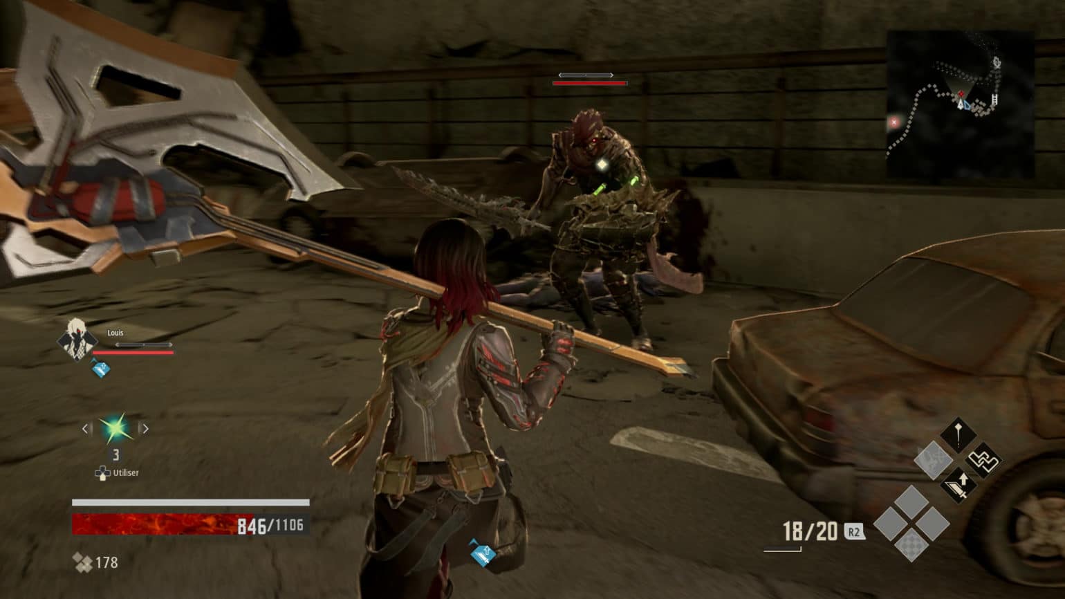N’espérez toutefois pas changer de Code Sanguin à la volée, en cours de combat. Enfin, c’est théoriquement possible, mais il faut pour cela passer par un menu qui ne met pas le jeu en pause, et nous laisse ainsi à la merci de n’importe quel assaut… Un menu assez complexe, qui plus est, qui donne lui-même accès à des sous-menus… Pour être honnête, nous avons un peu manqué de courage dans la lecture de ces caractéristiques, et souvent choisi nos équipements en regardant lequel offrait le plus de caractéristiques bleues (donc bonifiées) et le moins de rouges (c’est-à-dire malussées) possible… Oui c’est grossier. Pardon.