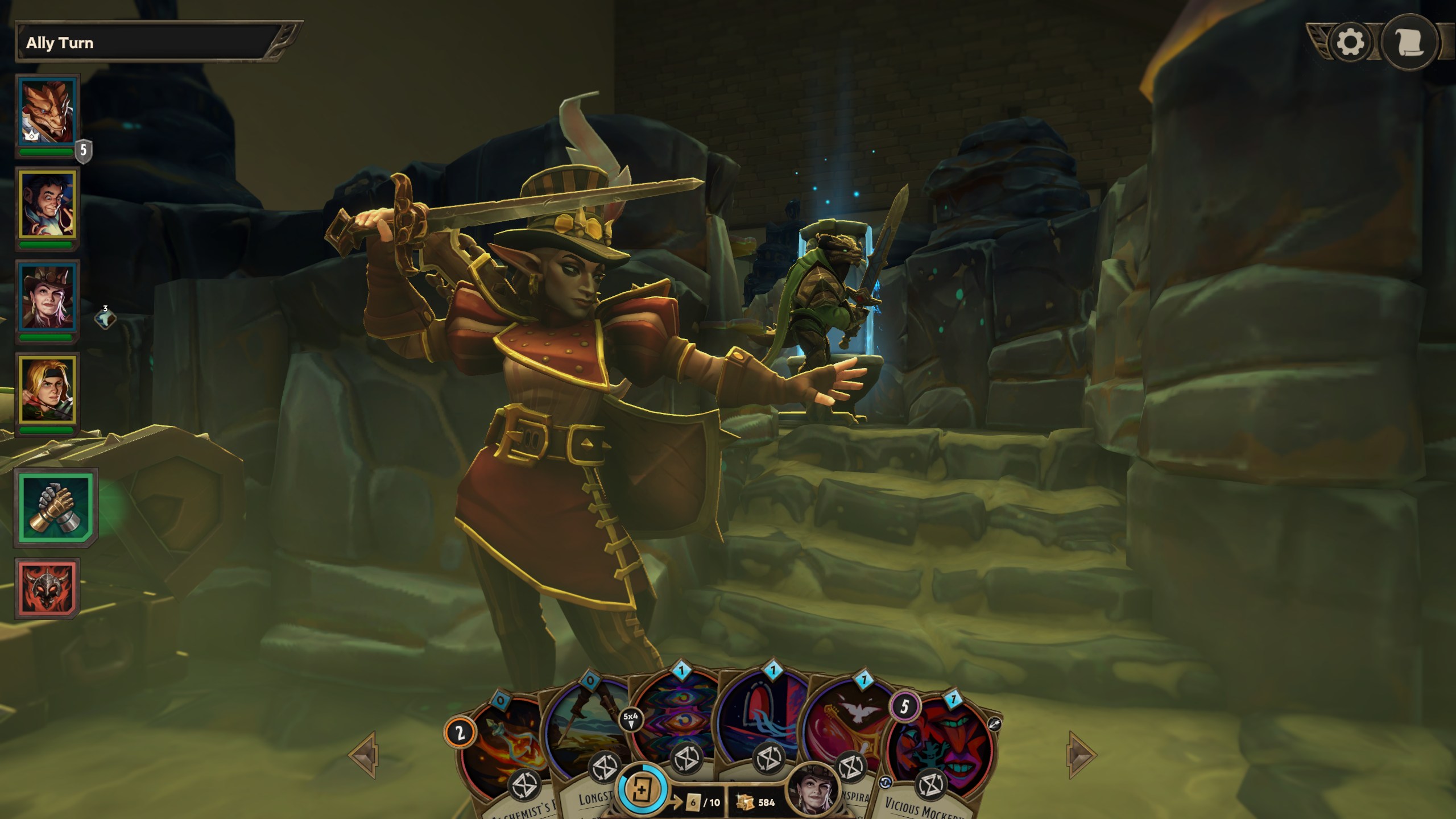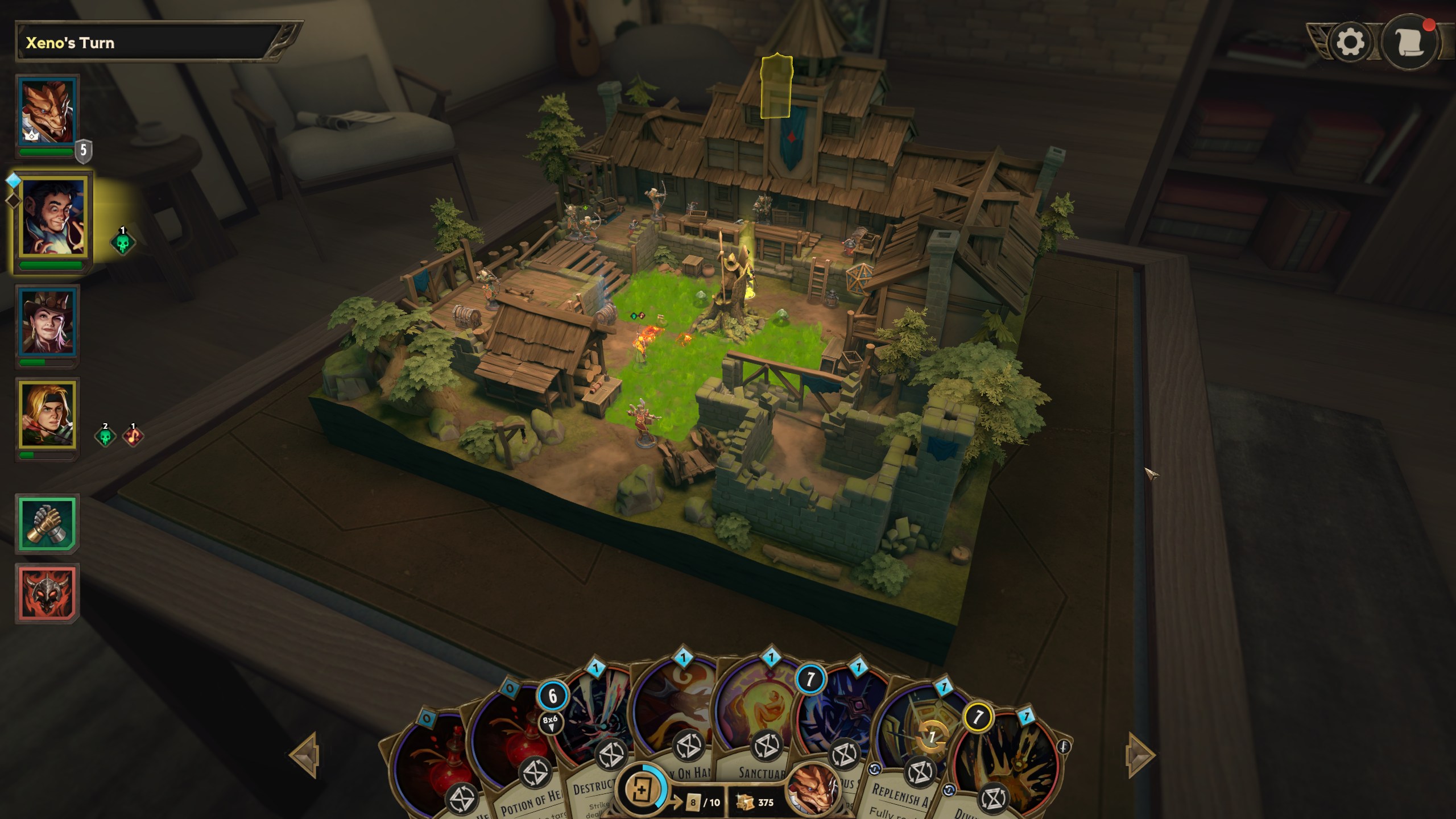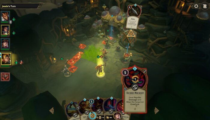 Le principe de base de Demeo est simple, on dirige un groupe de personnages possédant un ensemble de cartes et deux actions par tour pour arriver au fin fond du donjon et abattre le boss. Une action permet de se déplacer de tant de cases ou bien d’utiliser une de nos cartes représentant généralement un sort ou un objet.