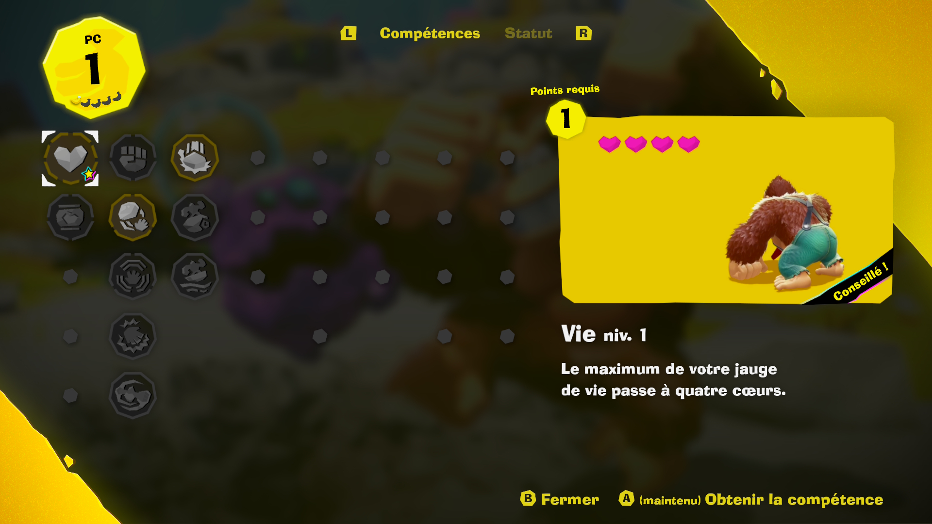 En effet, les 700 bananes à récolter ne sont pas de simples trophées ; elles octroient des points de compétence (un point toutes les cinq bananes) pour débloquer de nouvelles capacités comme un double saut ou des coups supplémentaires. De plus, ces compétences possèdent elles-mêmes des niveaux, et il est donc possible d’augmenter plusieurs fois la même compétence, moyennant un coût plus important à chaque fois.